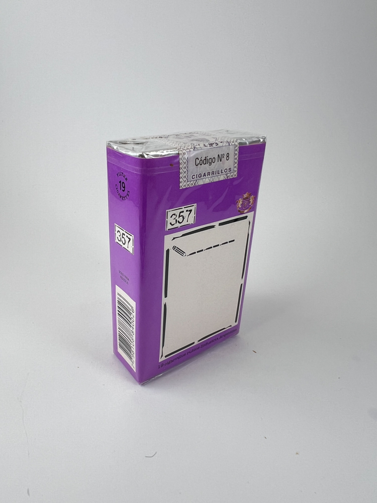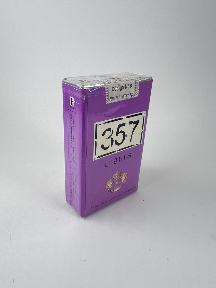 This pack of 357 Lights cigarettes is exclusively purple in color – a very rare solution in the cigarette design market, which allows this pack to immediately stand out from the rest. On the front part, the same „357“ logo is visible as on other versions of the series, but with the inscription „Lights“, indicating that this is a lighter version. Below is the coat of arms with the number „3“, and at the bottom of the pack it is indicated that this is „Industria Argentina“. The quantity of cigarettes is marked on the side – 19 pcs., which is again a non-standard choice. On the top part there is an Argentine excise stamp with „Código Nº 8“. The pack is original, with an intact film.