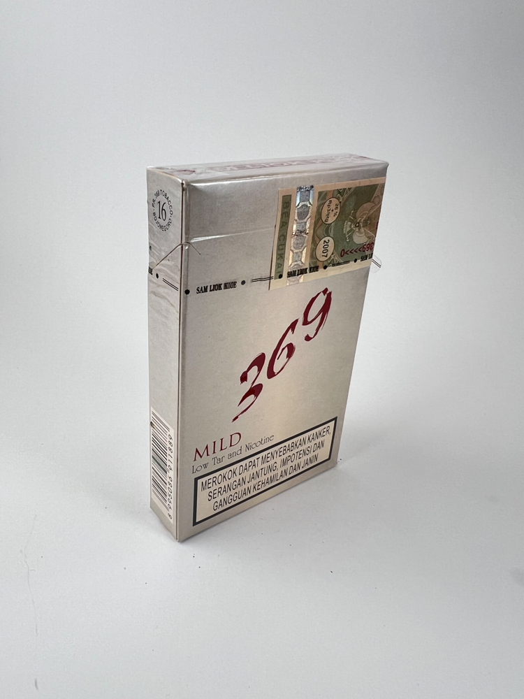 „"369 Mild" is an Indonesian brand of kretek cigarettes, distinguished by its modern, minimalist design. The pack is silver in color with a large red number "369" in the center, and the inscription "Sam Liok Kioe" is visible at the top. The design conveys the concept of "mild" (light) taste - cigarettes are made from a specially selected blend of tobacco and cloves, characterized by a lower nicotine and tar content. On the back, a warning about the harms of smoking is indicated in Indonesian, as well as an excise sticker. The packaging is oriented towards young people and lovers of a milder kretek flavor.
