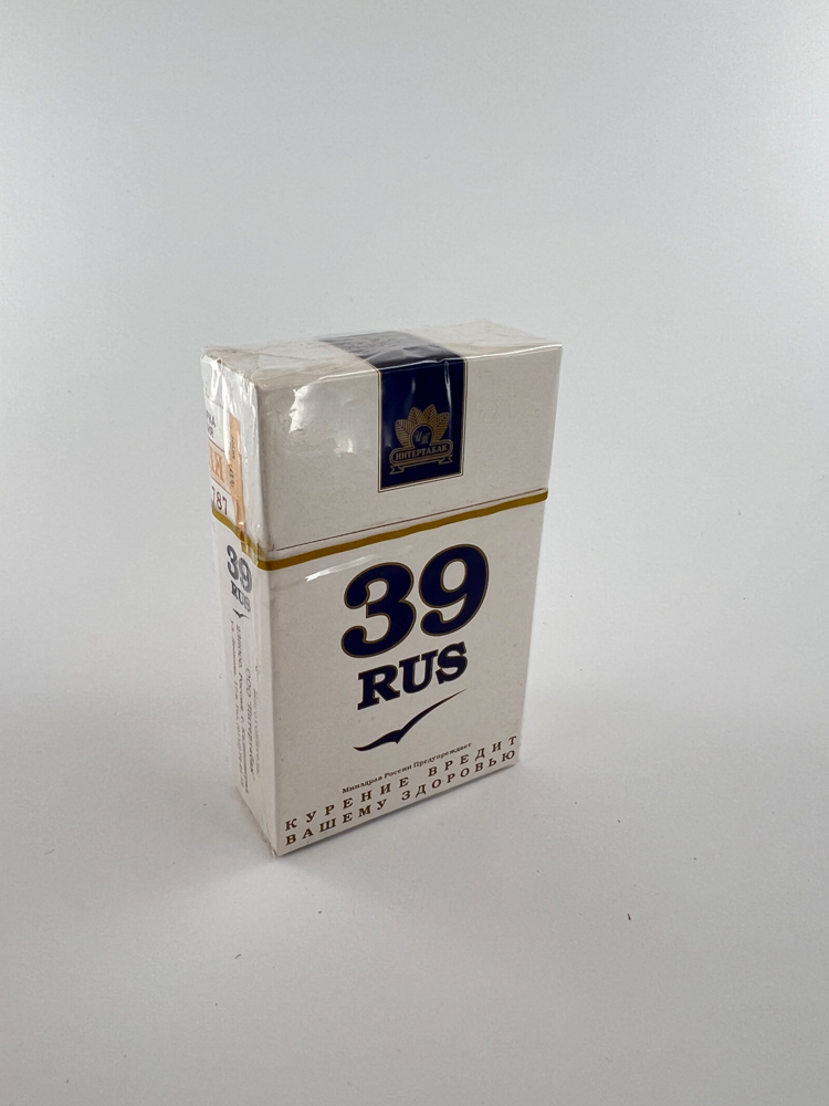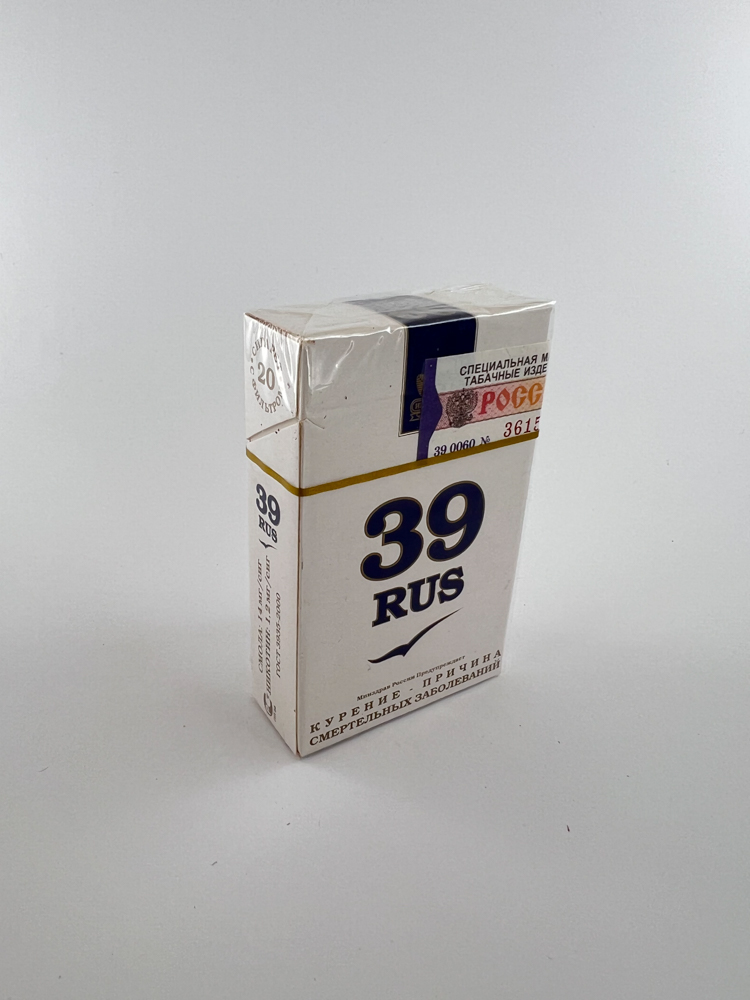 „"39 RUS" is an unusual, minimalistic Russian cigarette pack, featuring a white color, contrasting dark blue lettering and a gold line in the middle. The top part features the manufacturer's logo "Питерская" (St. Petersburg Tobacco Factory), and a warning in Russian about the harms of smoking. The number "39" is most likely related to a regional or factory code, but there is no officially confirmed meaning. This edition was produced for the local Russian market.