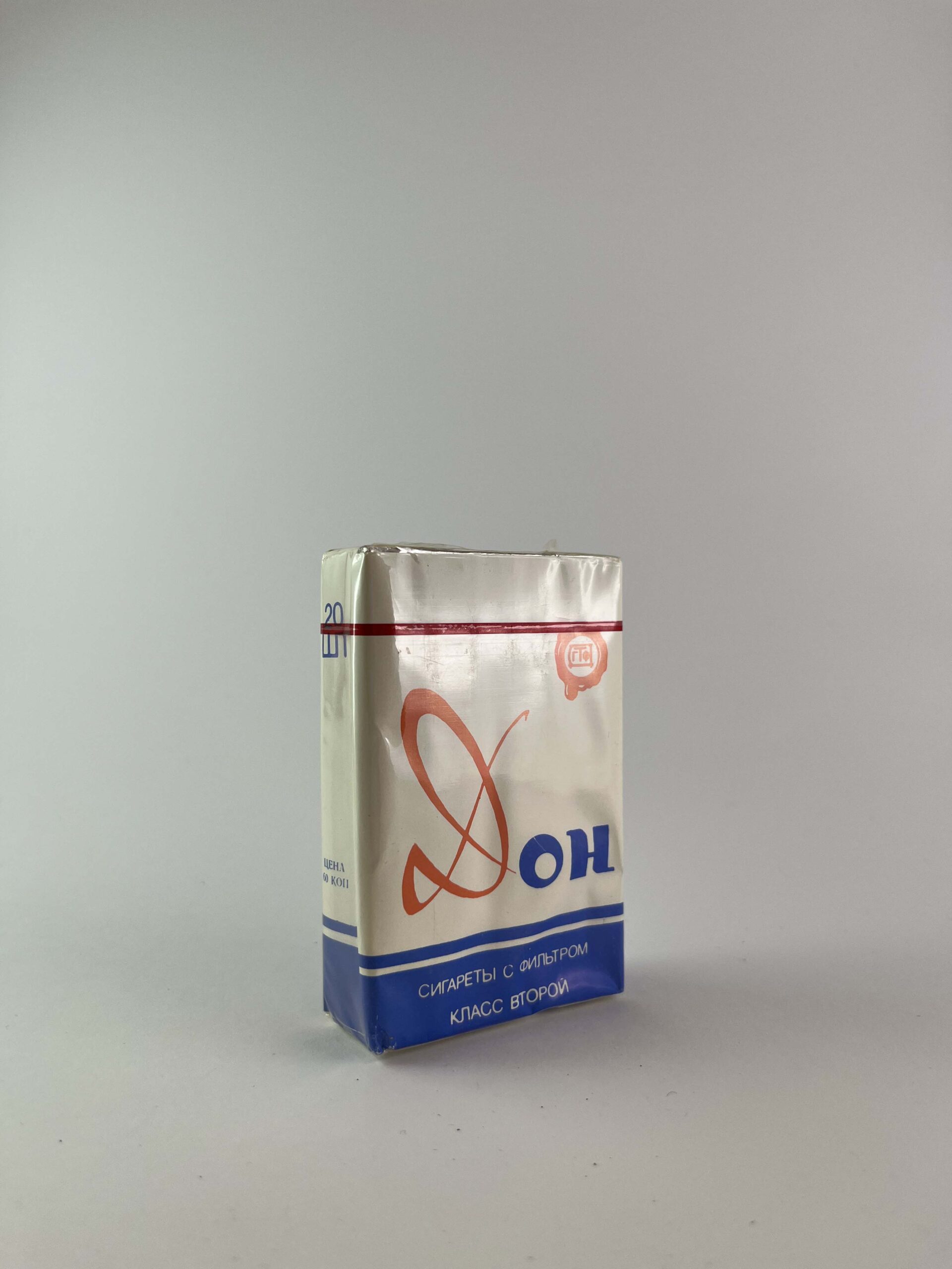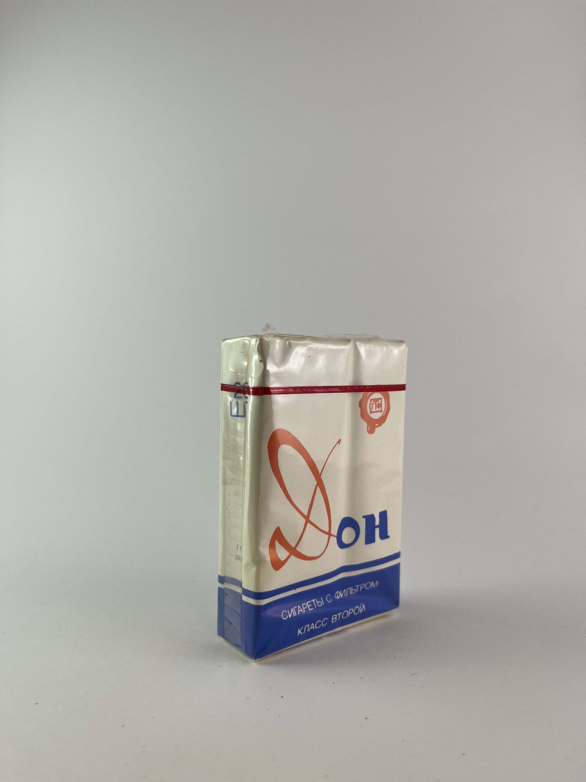 Description: The Don cigarette pack features a minimalist design with white color and blue and red elements. The logo is bright and immediately recognizable. The name of the cigarettes „Don” is written in it, creating an association with the famous regions of the Don River. The design is simple, reflecting the mass production typical of the Soviet Union period. The pack is in undamaged condition, with the original protective film.