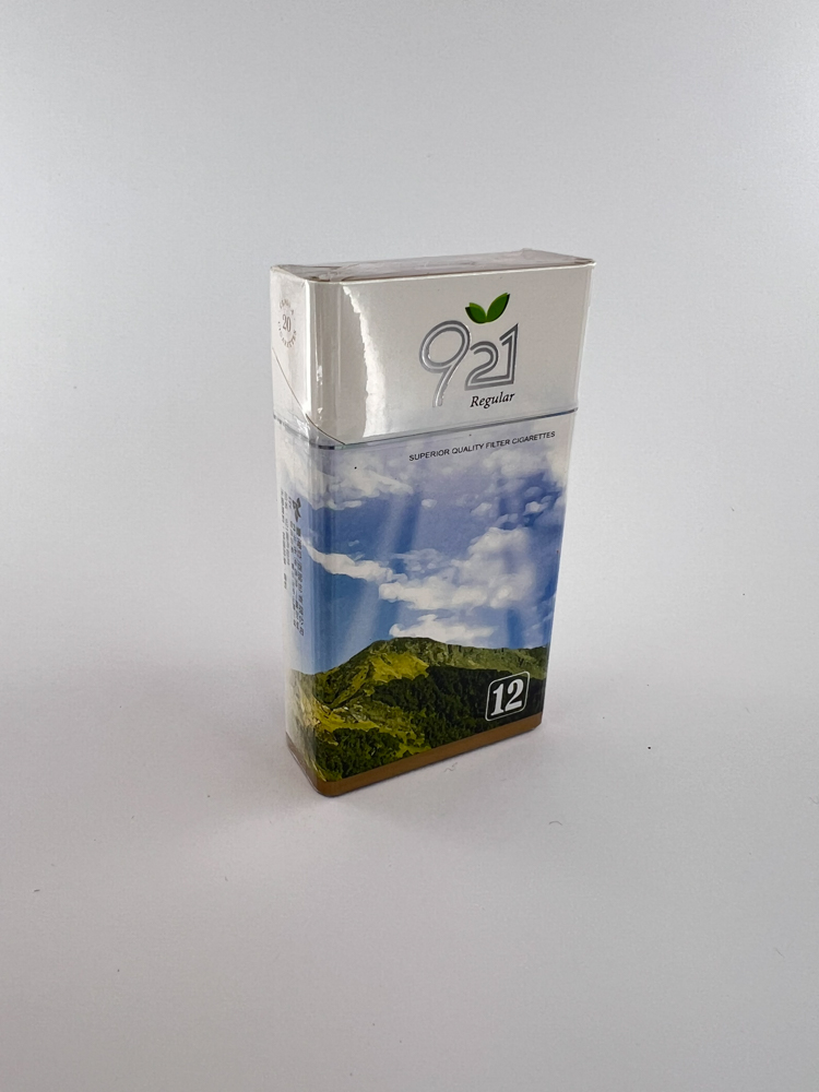 Description: The 921 Regular cigarette pack is distinguished by its nature motifs – the lower part depicts a mountainous landscape and a blue sky, and the upper part – a white background with the inscription „921 Regular“ and a green leaf symbol. This creates an image of naturalness and cleanliness. The pack is marked with „Superior Quality Filter Cigarettes“ and the number 12 (most likely indicating the tar or nicotine content). The back part contains a warning in Chinese, and the text in English announces „professional tobacco choice“. The health warnings and the nature of the design indicate that the pack is intended for the Taiwanese market.