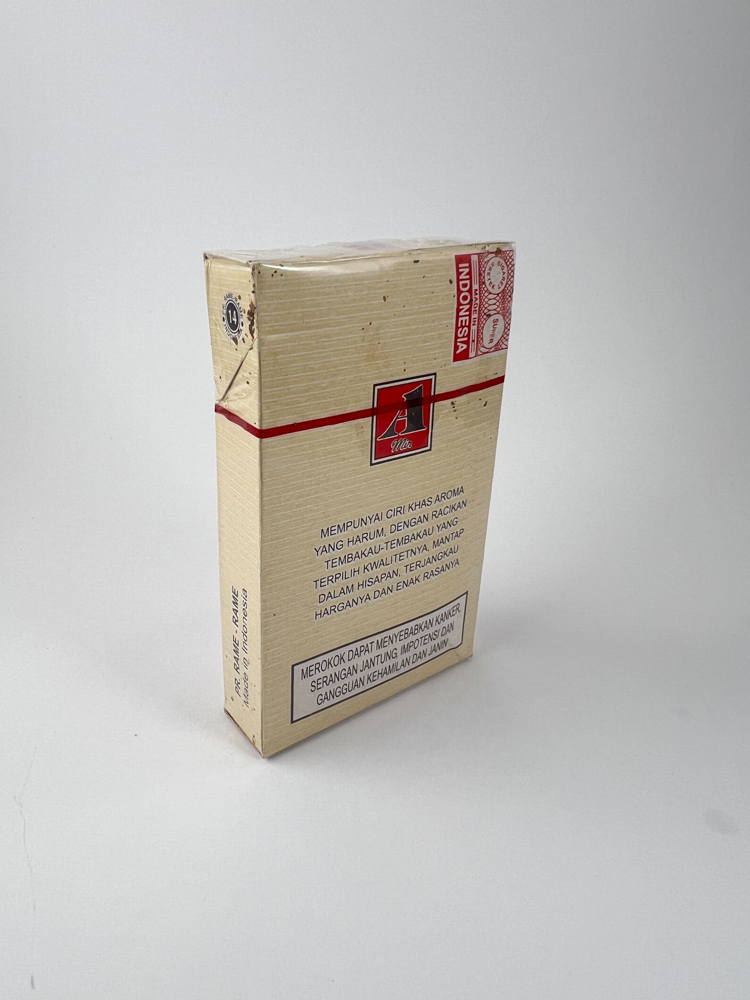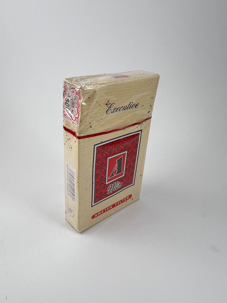 A Mild "Executive" version is a rare line of kretek-type cigarettes from Indonesia. The pack is light yellow in color, decorated with a minimalist red geometric pattern in the center with the letter „"A"“, symbolizing the "A Mild" series. On the front, the inscription "Executive" gives the road a luxurious image. On the back, a description in Indonesian of the properties of the tobacco blend and its distinctive aroma is provided. A warning about the dangers of smoking is also visible, in line with the health warnings used in Indonesia at that time.