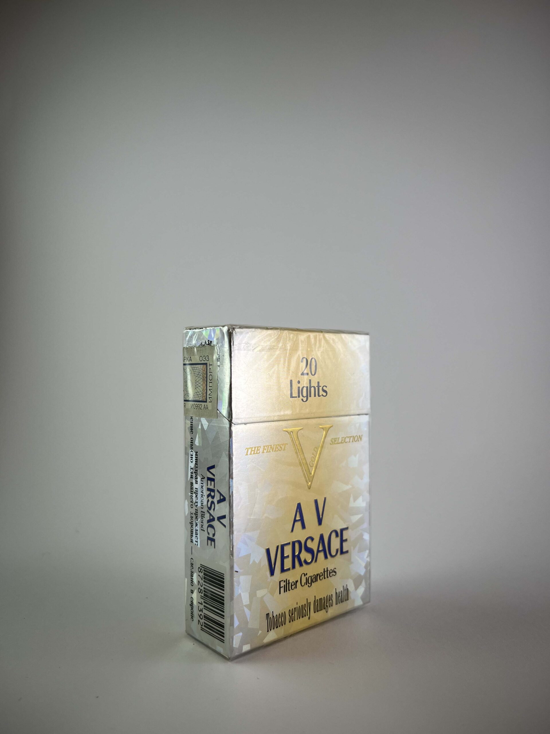 The AV Versace „Lights” cigarette pack features an elegant and luxurious design that reflects a high-quality image. Gold tones combined with light white details create a refined aesthetic. The pack clearly displays health warnings highlighting the risks of smoking.