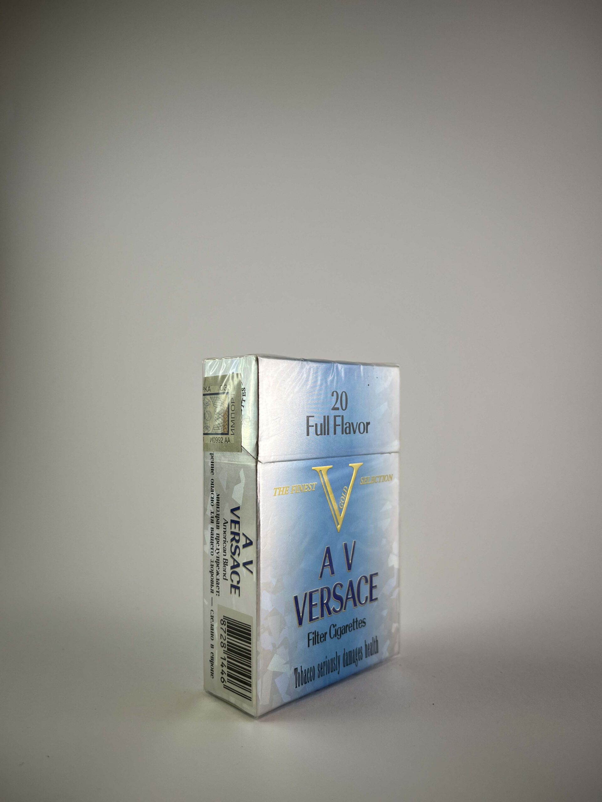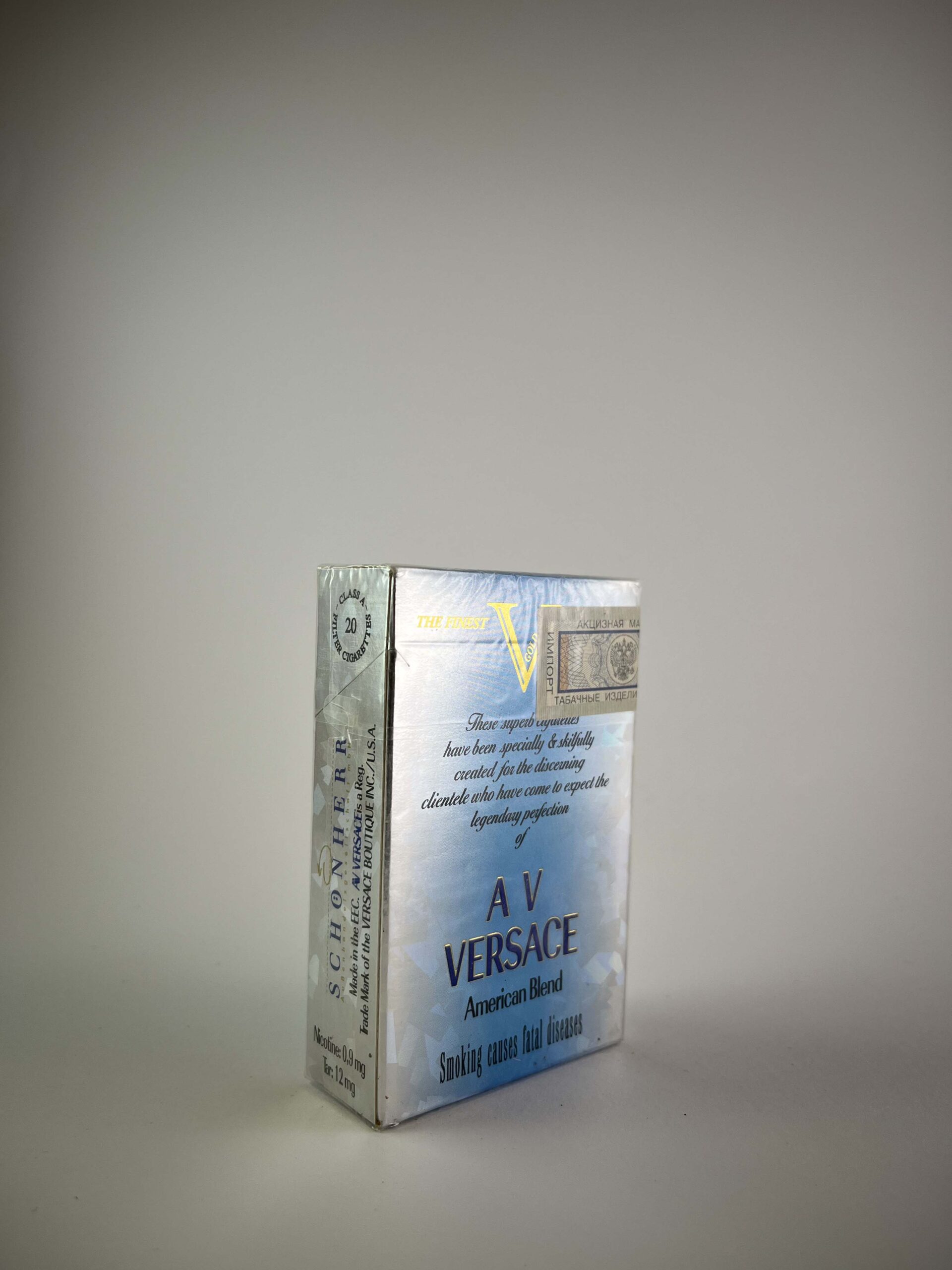„The pack of AV Versace Full Flavor American Blend cigarettes features a luxurious, light blue design that resembles a crystal surface. The pack features an elegant gold-colored “V„ logo and texts that emphasize the high quality of the product. The inscriptions in English and Russian indicate that the product was intended for various markets. This pack can be considered a collector's rarity, especially given its connection to the theme of luxury and fashion.