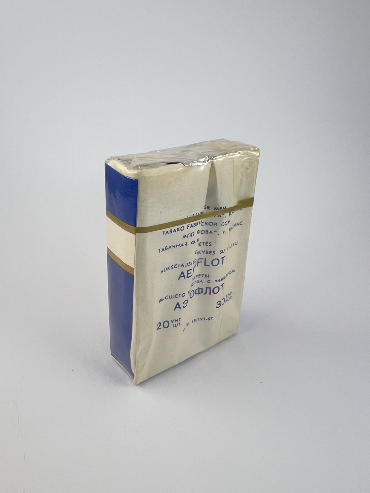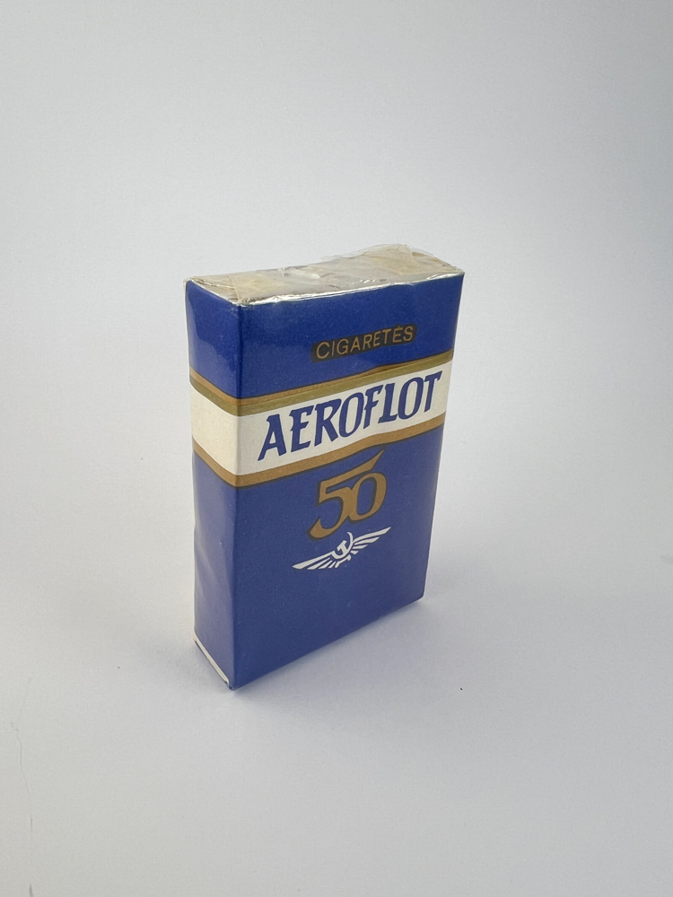 Aeroflot 50 is a special anniversary edition dedicated to the 50th anniversary of the USSR airline company Aeroflot. The pack is distinguished by its rich blue color and the golden number „50“, under which the legendary wings of the USSR with a sickle and a hammer are depicted. The back of the pack contains information in as many as five languages, including Lithuanian: „Highest quality cigarettes with a filter“. The manufacturer is Kaunas Tobacco Factory. This edition was intended for representation, therefore it was printed with high quality, with details that distinguish it from other products of the period.