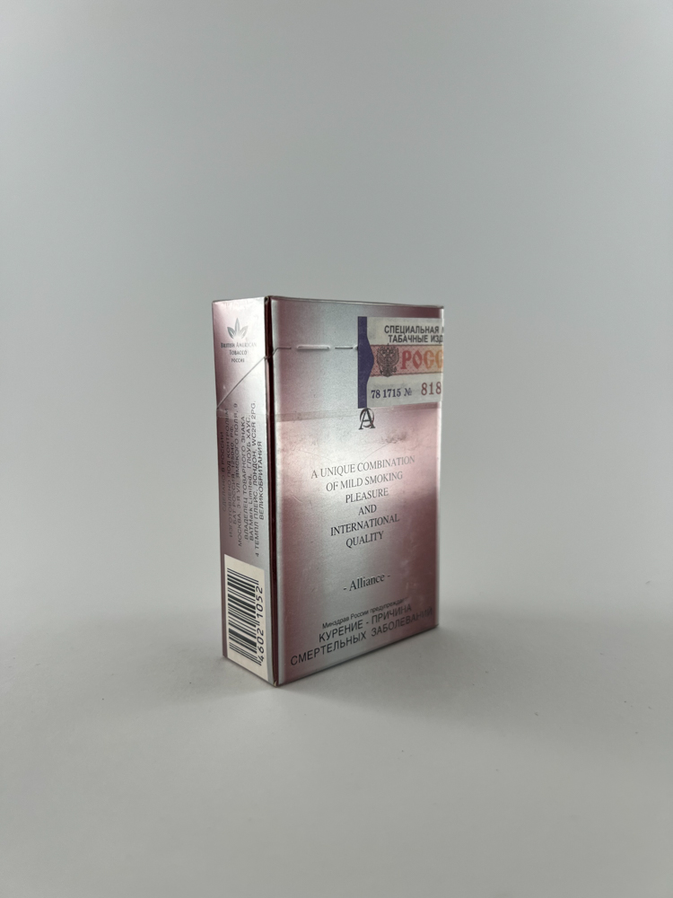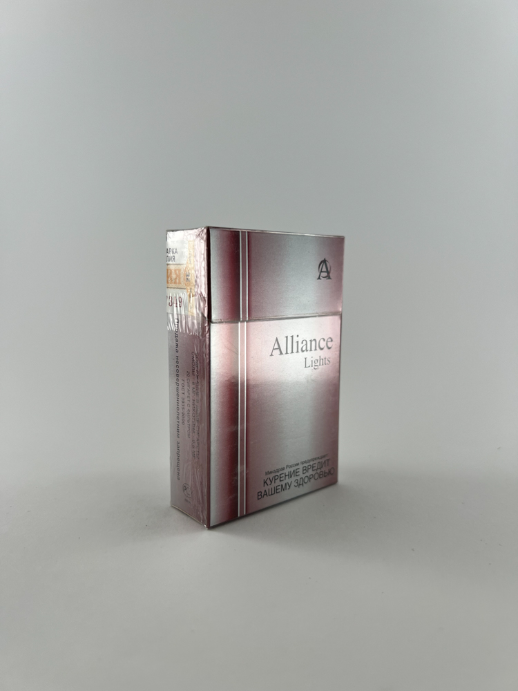 „Alliance Lights is an elegant, light pink-metallic package with silver accents. The front side is dominated by the minimalist inscription "Alliance Lights", on the side there is a Russian warning about the harm of smoking. On the back side there is a prominent slogan in English: „"A unique combination of mild smoking pleasure and international quality"“. The excise mark "Россия" (Russia) indicates that this package is intended for the domestic Russian market. The package is unopened, the original film with the excise sticker is intact.