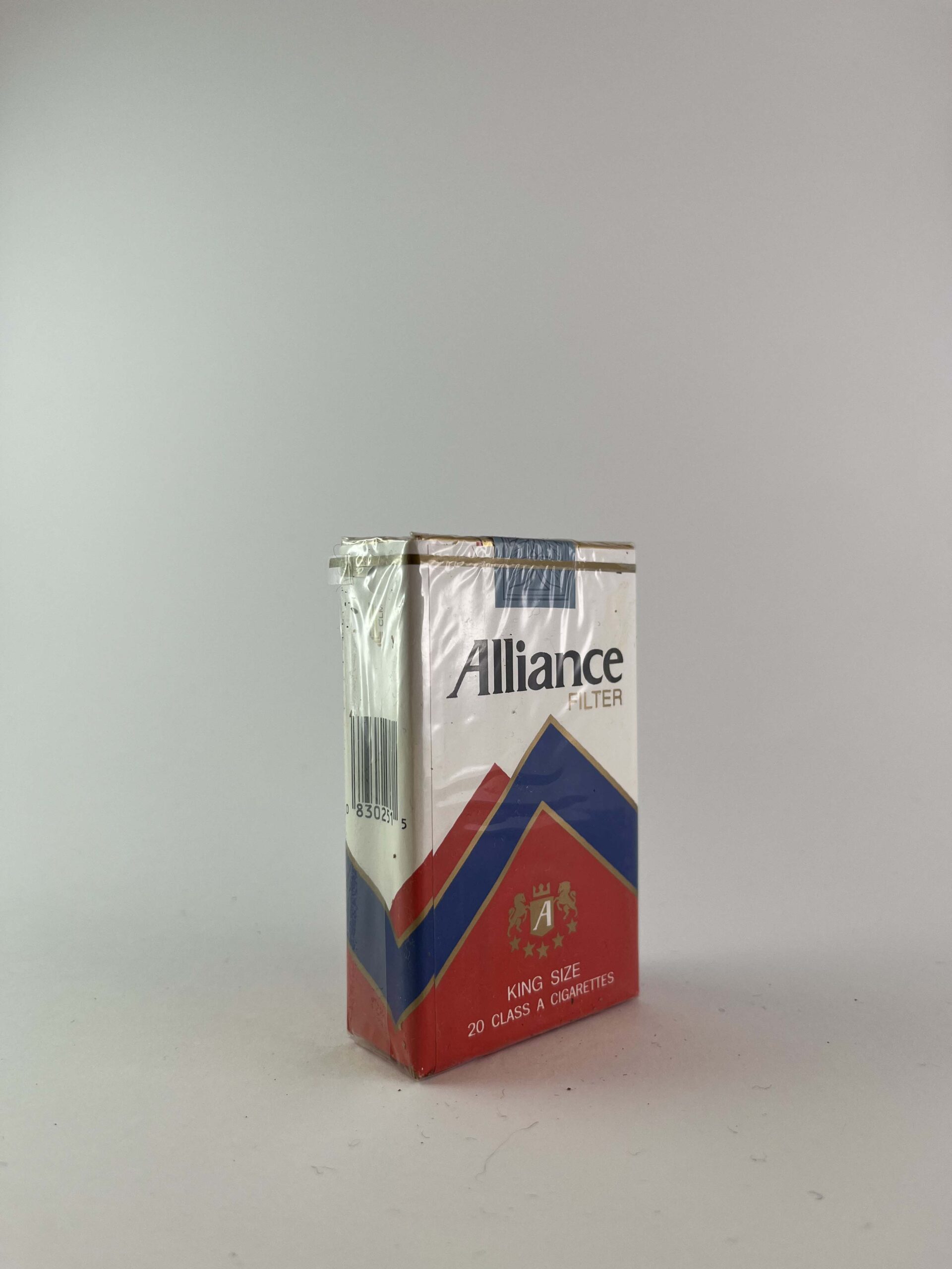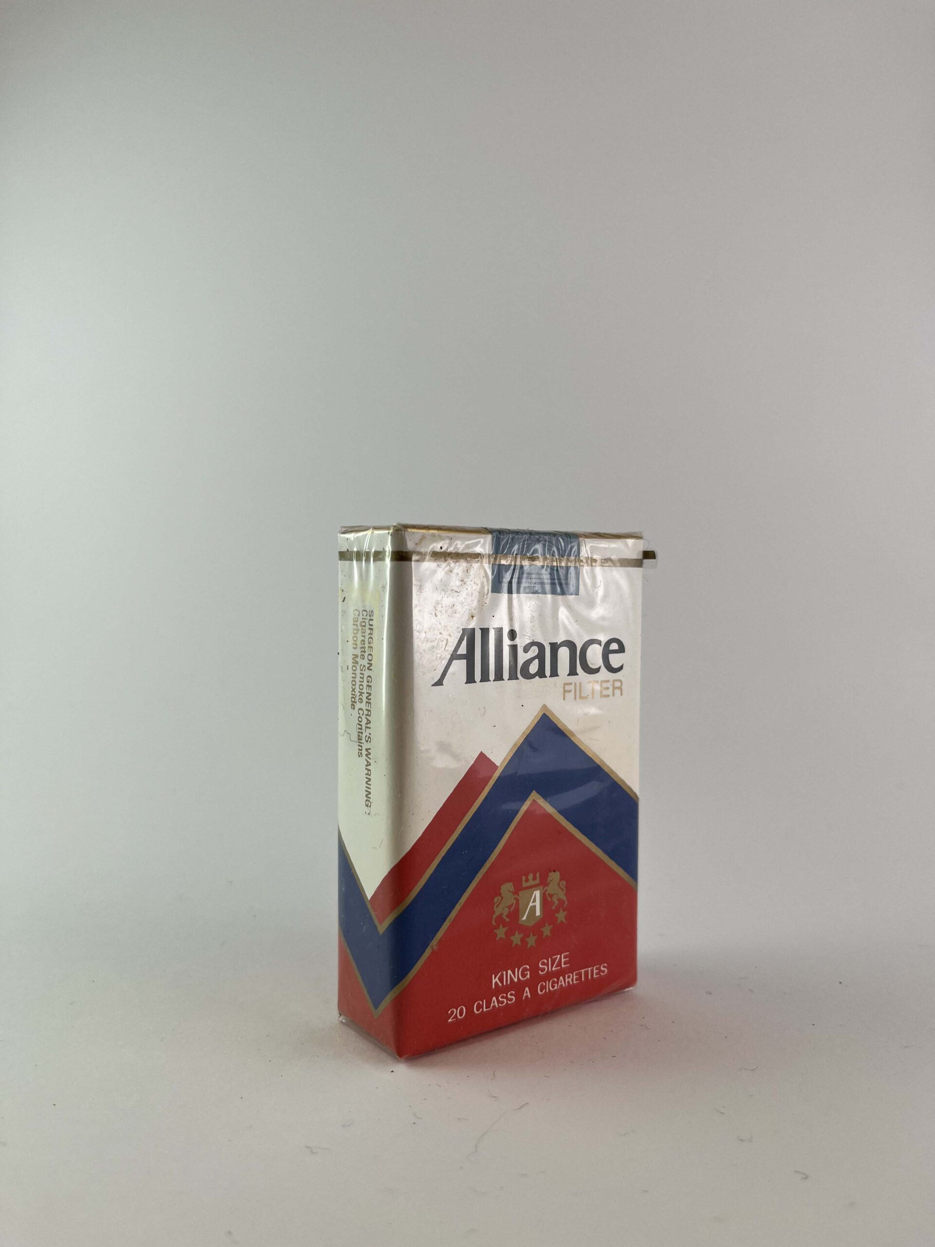 Alliance Filter cigarette pack with a bold red, white and blue design. This design creates a strong and traditionally American image. The pack is originally sealed, which adds additional collector value. The "King Size" on the pack indicates that the cigarettes are of the standard larger size.
