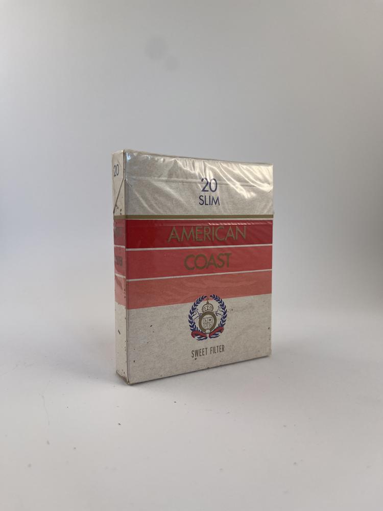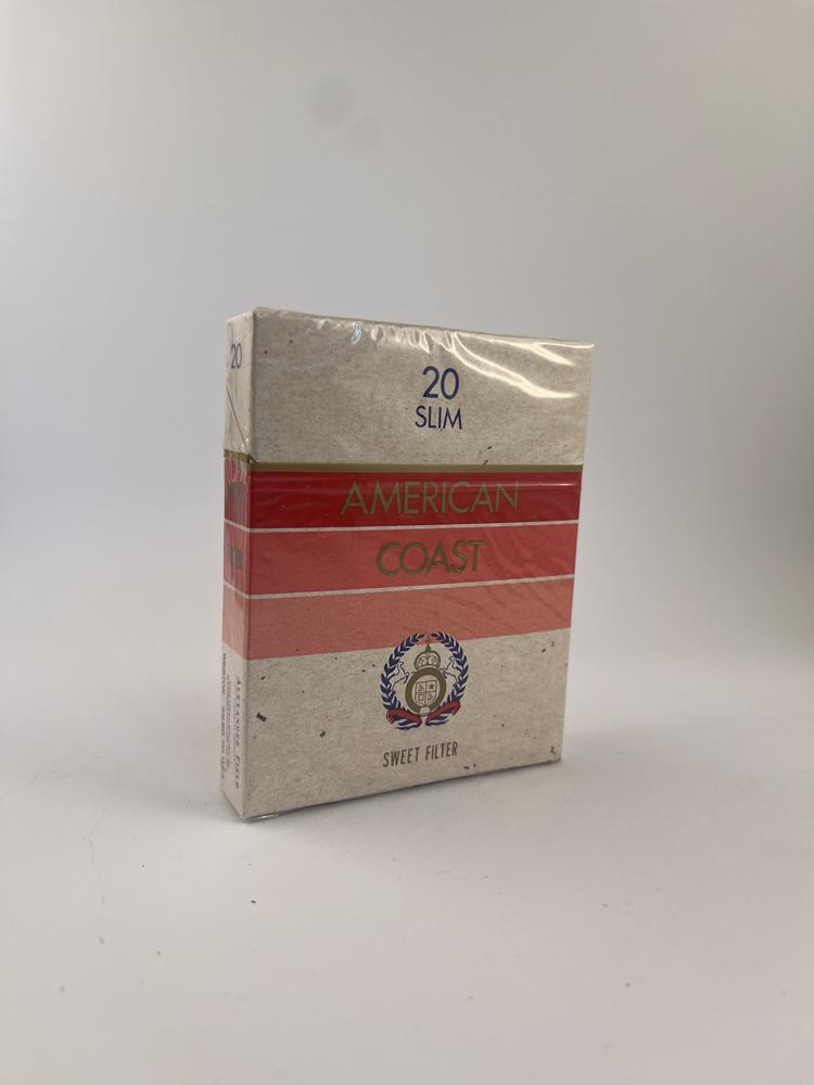 Name AMERICAN COAST written in gold letters, and "20 Slim" is marked at the top, emphasizing that these are thinner cigarettes.