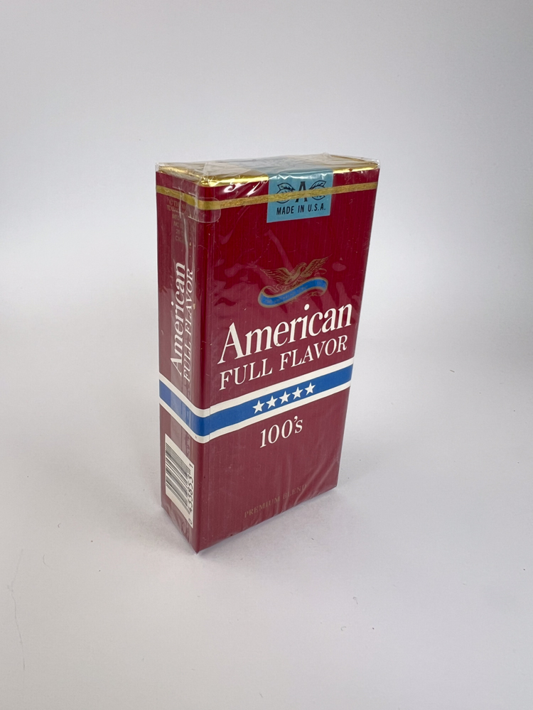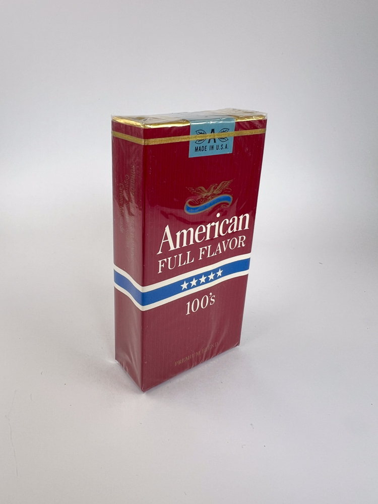 „"American Full Flavor 100's" is a typical example of US tobacco products, reflecting the American style of the late 1980s and early 1990s.