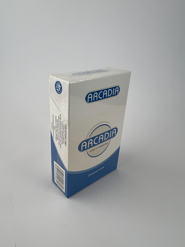 „The Arcadia cigarette pack features a modern, clean white and blue design with an oval logo in the center. The front side is marked with “Class A Cigarettes„ and “Charcoal Filter„, while the back side has a warning in Chinese, as well as a visible production date. The pack is intended for the Taiwanese market, as evidenced by the specific fonts and layout of the warnings. Information about export and targeted distribution is provided on the side. The design retains the clear functionality characteristic of East Asian products in the modern era.