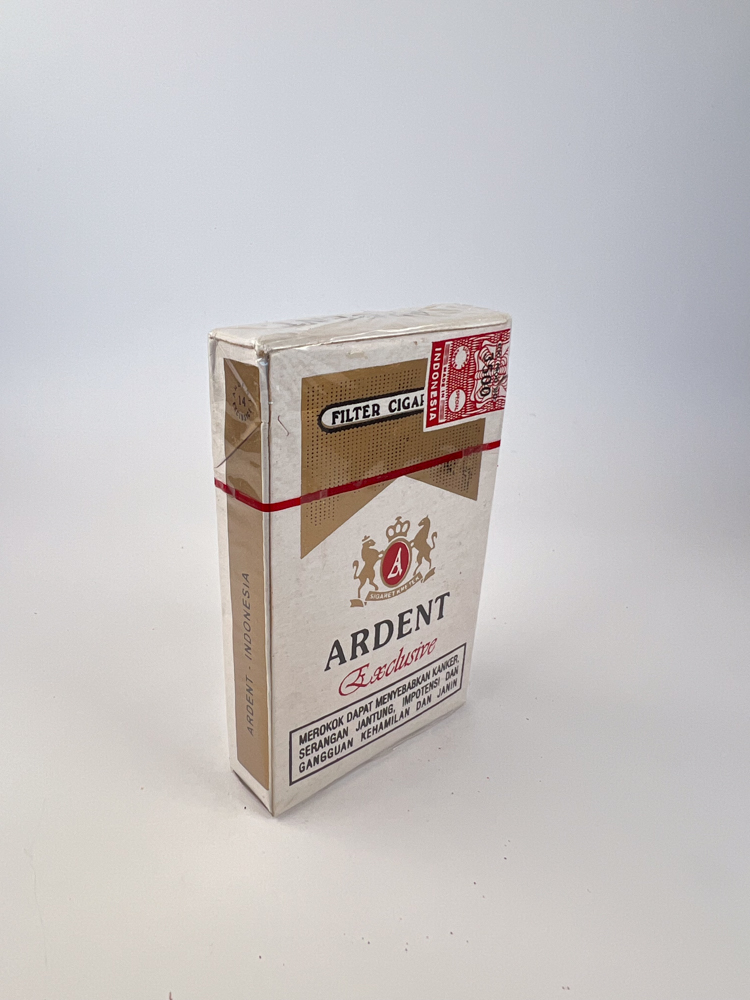 Ardent Exclusive – an elegantly designed Indonesian cigarette pack that maintains a classic European style. The light cream background with gold and red details gives the pack a luxurious feel. At the center of the design is a red „A“ in the coat of arms, surrounded by lion figures and a crown, which evokes associations with British-style tobacco brands.