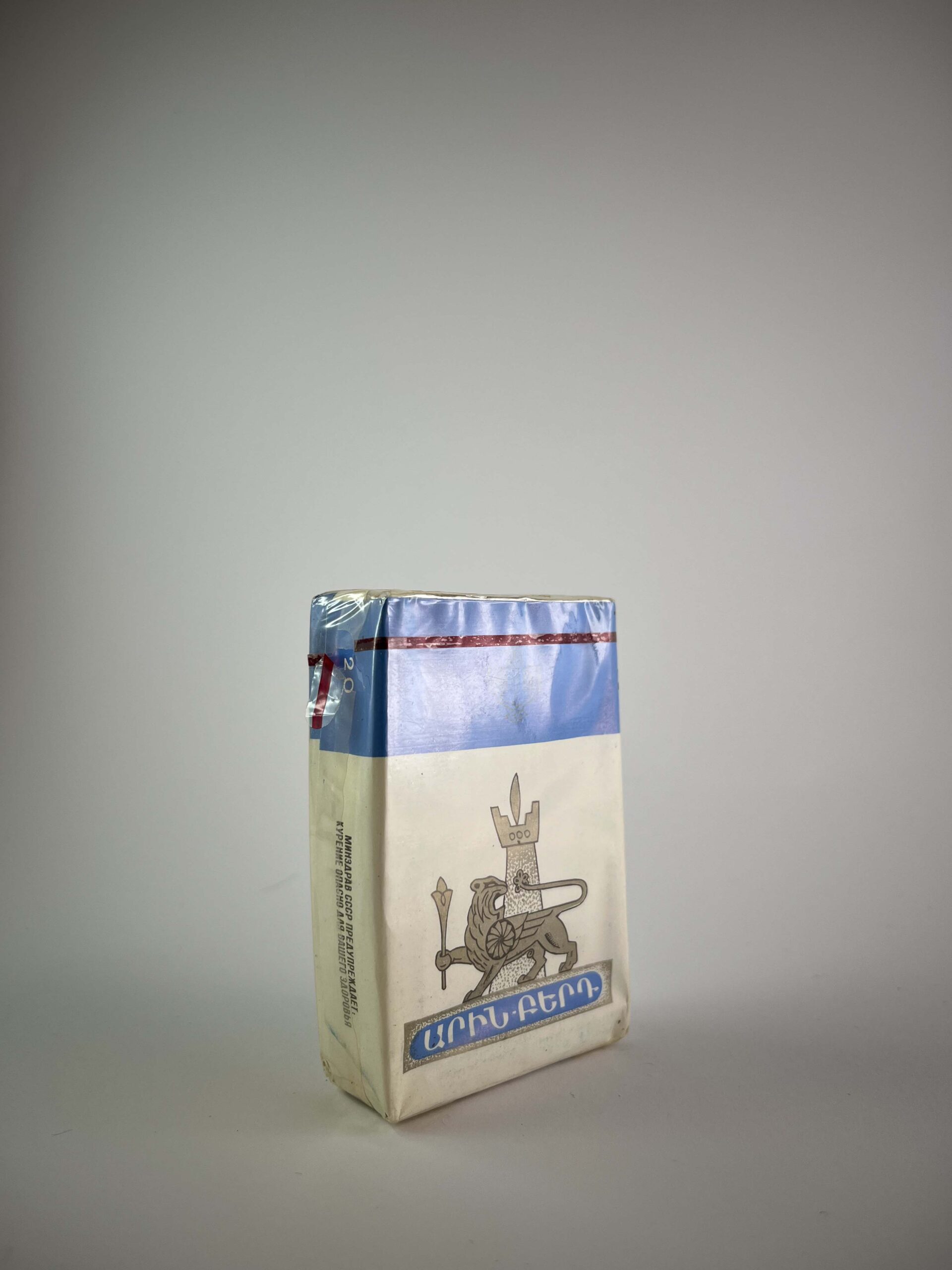 „The Arin Berd cigarette pack features a traditional and simple design that reflects the influence of local Armenian culture. The pack features Armenian symbols – a stylized lion and a tower, which adds visual authenticity. The pack is made of soft material, which was common for such cigarette packs at the end of the 20th century. The texts are presented in Armenian and Russian, indicating international ties with post-Soviet countries. The warning about the harm of smoking is written in Russian.