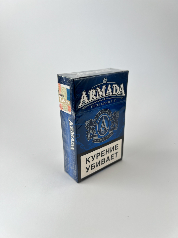 „Armada International“ cigarečių pakelis pasižymi tamsiai mėlynu dizainu su sidabriniu logotipu bei ženklu „Innovation“. Ant pakelio pavaizduotas ženklas su raide A ir karūna, o apačioje – užrašas „International“. Rusų kalba pateikti įspėjimai apie rūkymo pavojų („Rūkymas žudo“, „Neišnešiotumas“) su grafinėmis iliustracijomis. Kairėje pusėje yra rusiškas akcizo ženklas. Vizualiai pakelis perteikia pigių masinės gamybos produktų estetiką, skirtą vidaus rinkai.