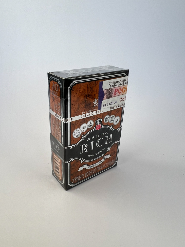 „The Aroma Rich Irish Coffee cigarette pack features a unique design reminiscent of aged wood texture, with black decorative frames and coin imitations in the center. The name Irish Coffee refers to the coffee aroma, which is the main feature of these cigarettes. This is one of the rare coffee-flavored cigarette variants on the Russian market, distinguished by a classic and luxurious image, and focused on consumers looking for a gourmet taste.