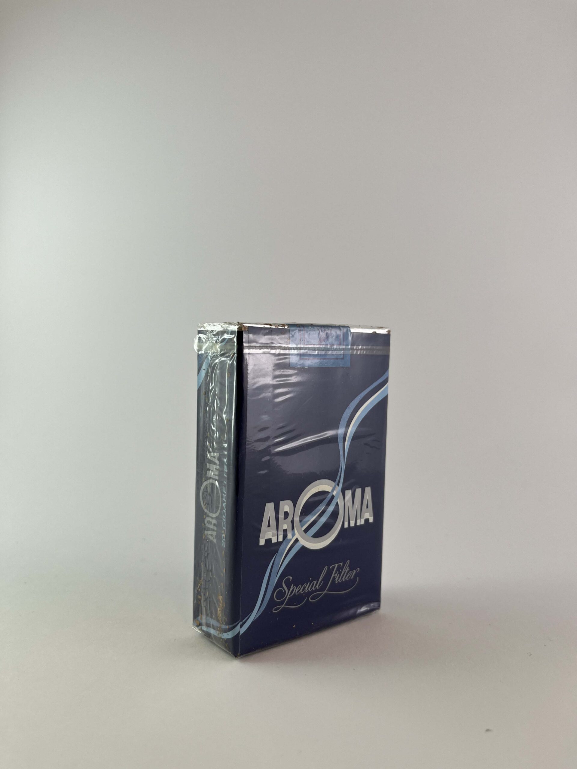 Description: This pack of "Aroma Special Filter" cigarettes features a dark blue design with white and light blue elements, which creates an elegant and modern impression. The inscription "Special Filter" is visible at the top of the pack, emphasizing the higher quality of tobacco and better filtration. The cigarettes are made in the Czech Republic and meet the design standards of the local market. The packaging is neat, sealed and well preserved.