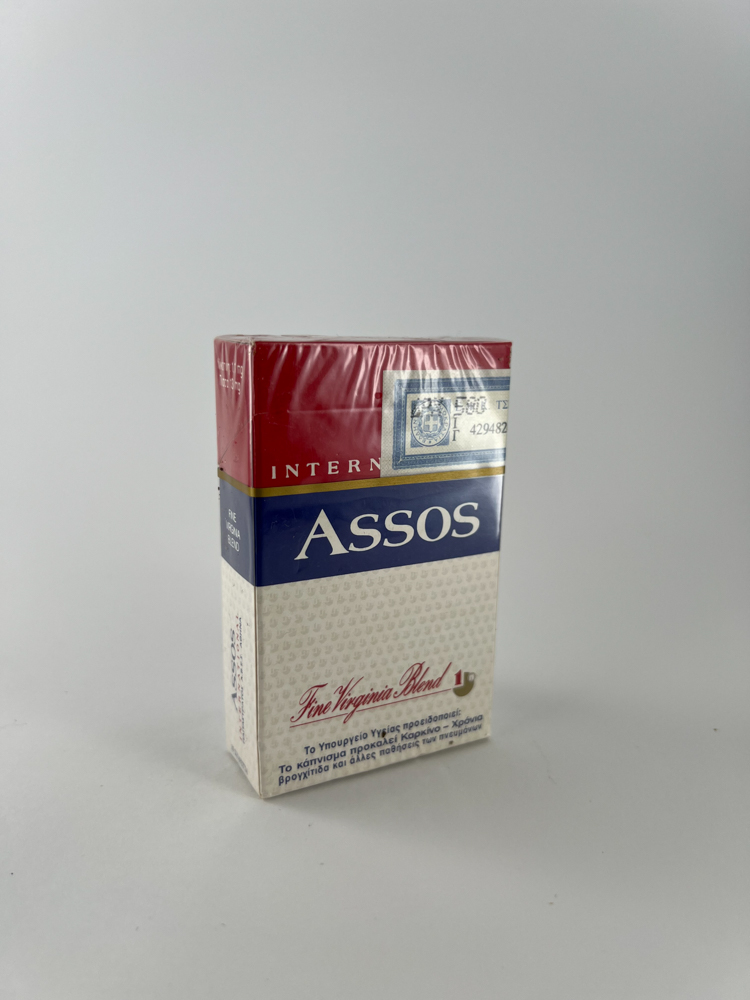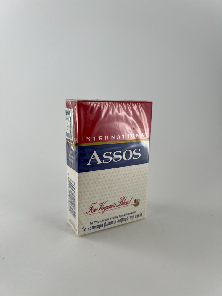 „Assos International is a cigarette brand for the Greek market, owned by Karelia. This pack has a classic design - the top is red, the middle is dark blue with the logo, and the bottom is light with small print and information about the tobacco type: "Fine Virginia Blend". The front and back have a health warning in Greek. The top has a Greek excise stamp - allowing for precise identification of the geographical market. This type of pack was common in Greek kiosks and supermarkets in the 2000s, and was later replaced by newer designs and larger health warnings after 2010.