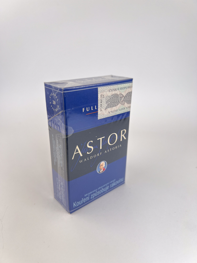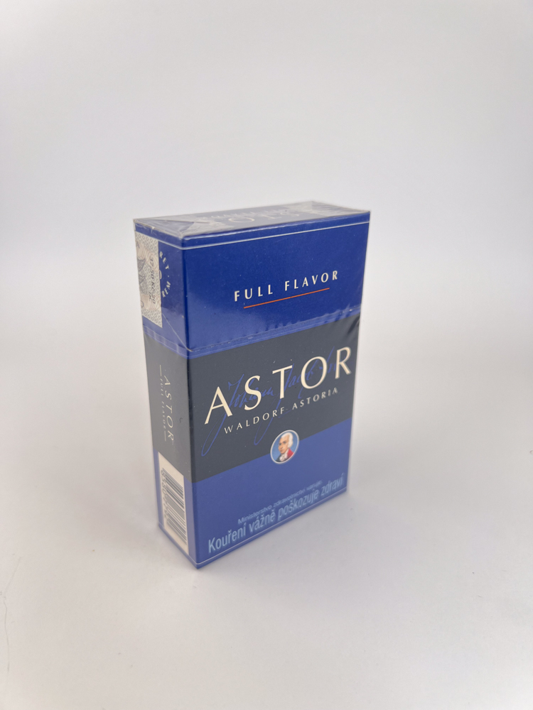 A navy blue, solid Astor Waldorf Astoria edition with contrasting silver lettering and a minimalist aesthetic. The lettering is highlighted at the top Full Flavor, emphasizing the classic taste. In the center – a large „ASTOR“ emblem with a small inscription „Waldorf Astoria“, complemented by a delicate handwritten signature and a small round emblem with a human portrait, giving the impression of tradition along the way. The design is seamless, with clearly expressed typography and high-quality printing texture. At the top is visible Czech Republic excise sticker, indicating local production and distribution. The lower part contains a warning in Czech, typical of European tobacco packets of that period. Visually, the packet conveys a balance of European classic style and modernity.
