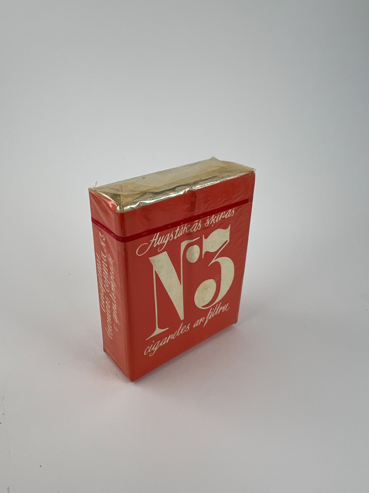 Description: This bright red cigarette pack with the large inscription „No. 3“ and the elegantly written „Augstākais šīras cigaretes ar filtru“ (highest grade cigarettes with filter) is one of the most notable Latvian releases from the USSR period. The design is clearly focused on simplicity and visibility. On the side, the inscription „Cena 25 kap.“ is visible, allowing for a more accurate dating of the release to the late USSR period, when prices were still regulated by the state. This pack can be attributed to the higher-class regional releases.