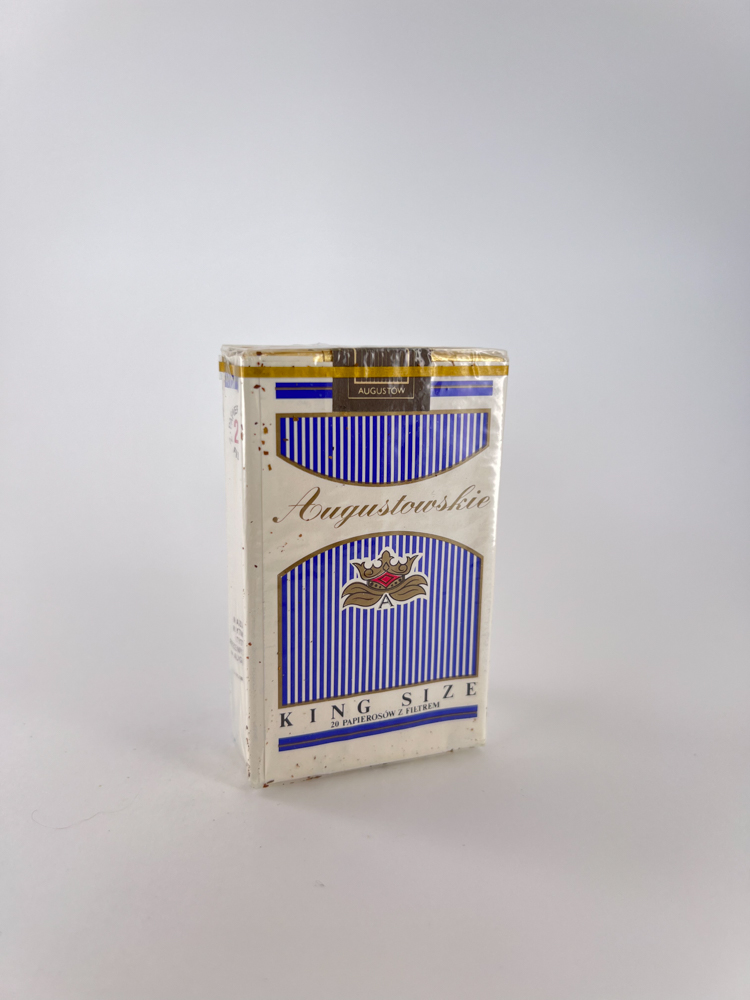 Description: Augustowskie – tai vienas iš tradicinių lenkiškų cigarečių prekių ženklų, pavadintas pagal Augustowo miestą. Pakelis pasižymi klasikiniu dizainu su vertikaliomis mėlynomis juostomis, vainiku ir herbu centre, bei aukso spalvos viršutine juostele. Užrašas „20 papierosów z filtrem“ (20 cigarečių su filtru) nurodo standartinį kiekį. Šis pakelis išlaikytas originalioje pakuotėje, tačiau su matomais amžiaus ženklais (dėmės, spalvos pokyčiai).