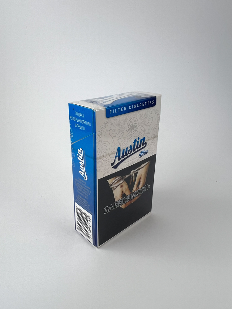 „The Austin Blue cigarette pack features a modern and contrasting design, dominated by blue and white. The front side clearly displays the Austin brand name, above which is the text "Filter Cigarettes" and the "1839" emblem. The back side displays an addiction warning along with an illustration. The sides indicate that the pack is intended for duty-free trade only and that sales to minors are prohibited. This indicates that this is a product intended for the duty-free market.