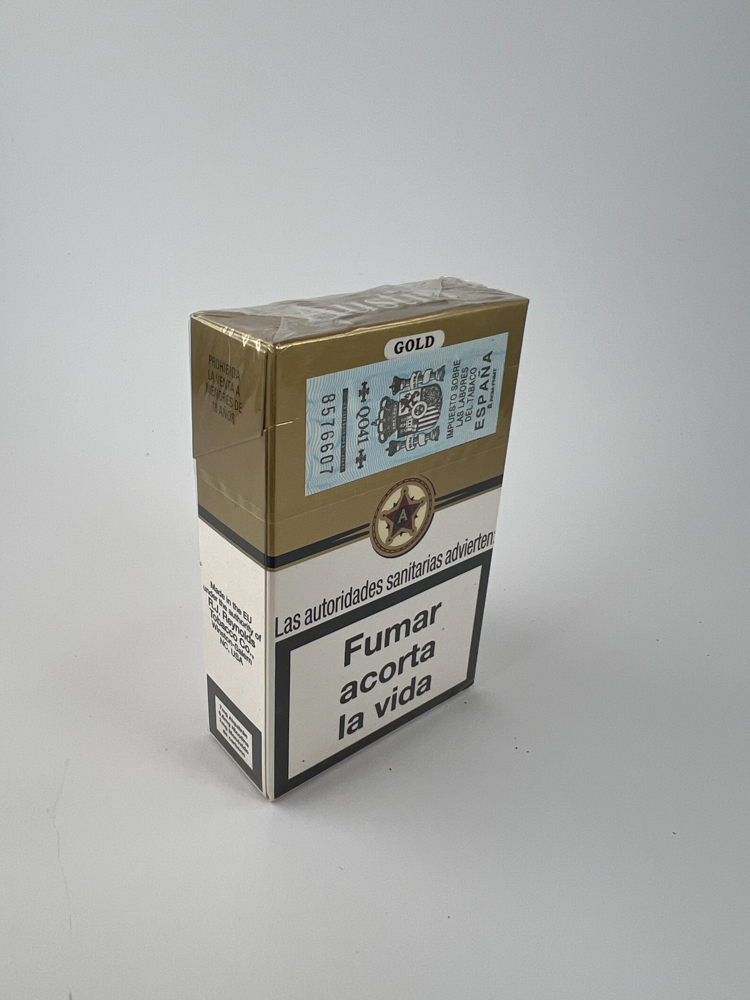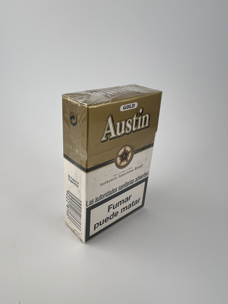 Description: The Austin Gold cigarette pack features a classic American-style design, with a dominant gold color at the top and a light background at the bottom. The pack features the „Authentic American Blend“ inscription, which refers to the US-style tobacco blend. The health warnings are in Spanish – „Fumar puede matar“ and „Fumar acorta la vida“, and a Spanish excise stamp indicates that the pack was intended for the Spanish market.