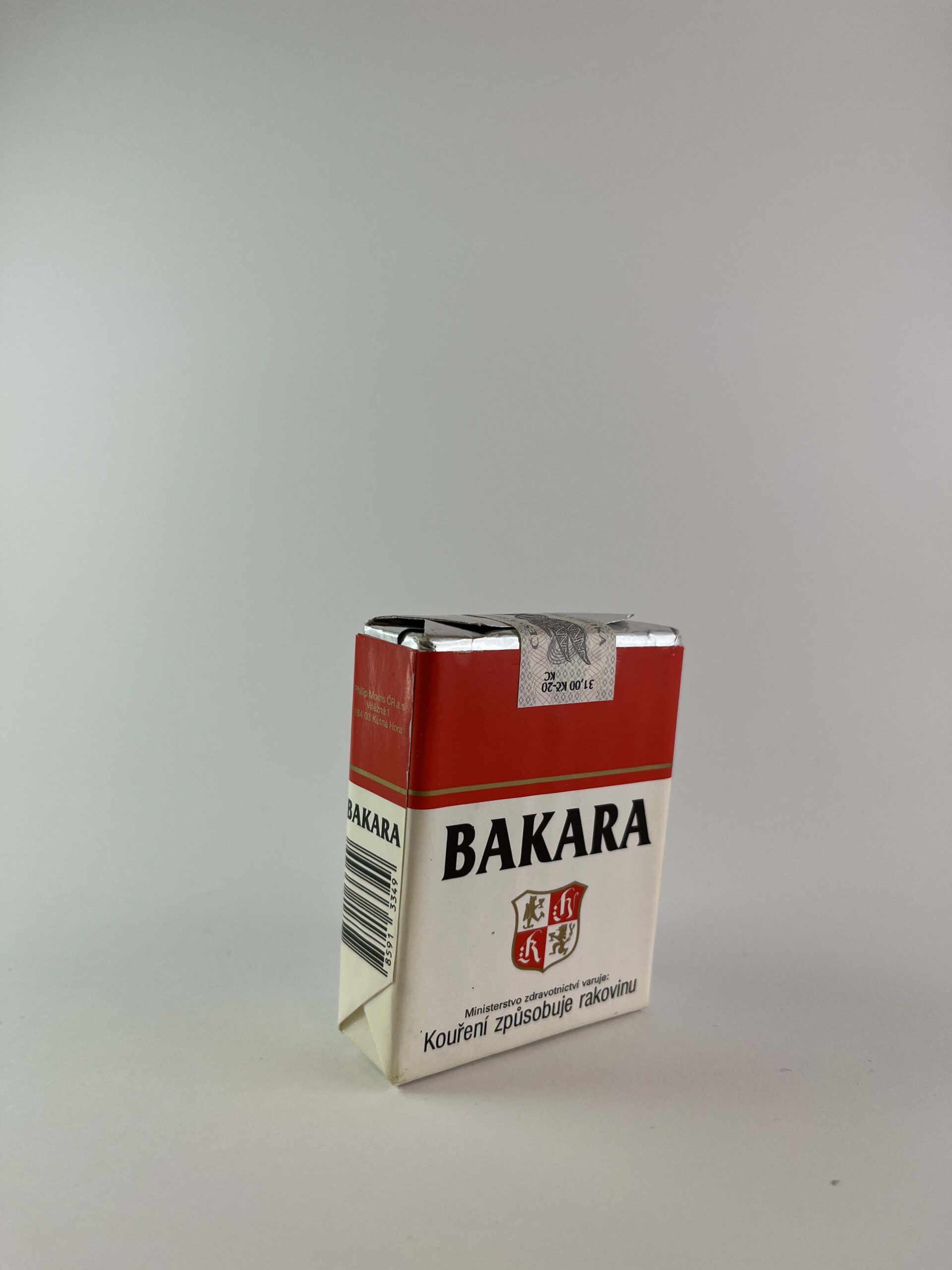 Description: The Bakara cigarette pack has an elegant design, with a bright red and white color scheme. The coat of arms motif in the center gives the pack a distinctive and memorable look. This model reflects the classic design principles of the Czechoslovak tobacco industry, maintaining a minimalist style with a functional warning about the harms of smoking at the bottom. The pack is distinguished by its high-quality paper and authentic printing.