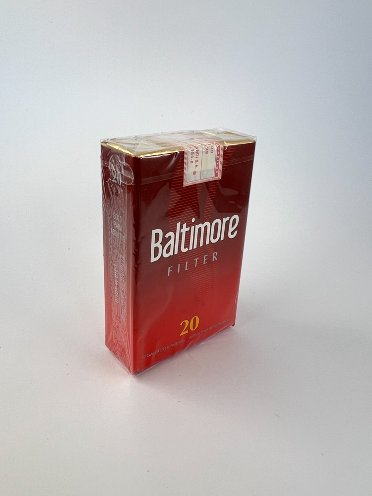 Description: „The Baltimore Filter is a bright red cigarette pack with a white logo on the front and the yellow number "20". The top shows the Argentine tax stamp. The back states that these cigarettes are made from selected national and imported tobaccos designed to provide the satisfaction of "100% tobacco". The bottom of the pack is marked with the "King Size" version, indicating the longer cigarette format. The sides have warnings in Spanish.