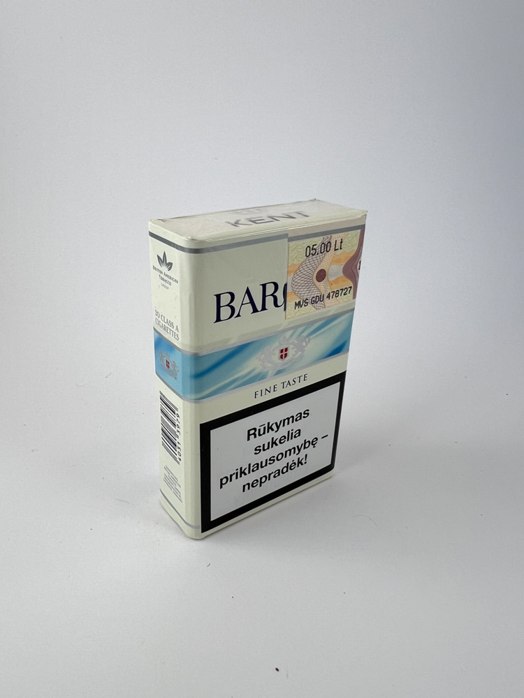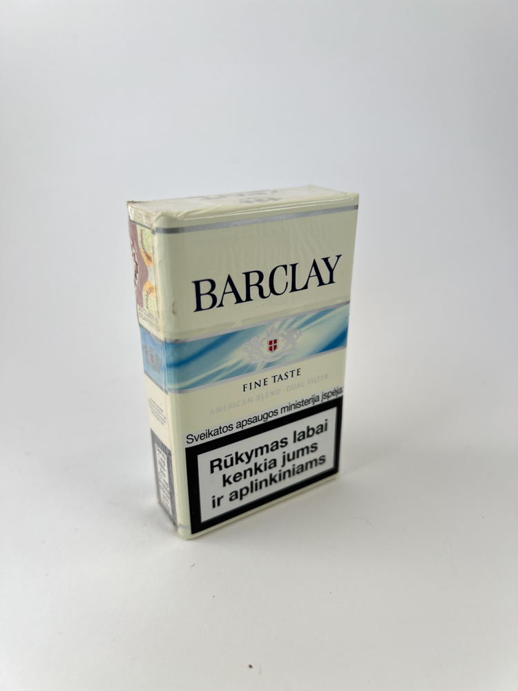 Description: Barclay's Fine Taste is an elegant and clean cigarette pack with light blue accents, symbolizing the softness and taste of the "American blend". The pack has a dual filter and emphasizes the unique taste. Warnings in Lithuanian and the price in old currency (litas) indicate that the pack was intended for the Lithuanian market. The excise sticker on top with a clearly visible denomination reinforces the historical value.