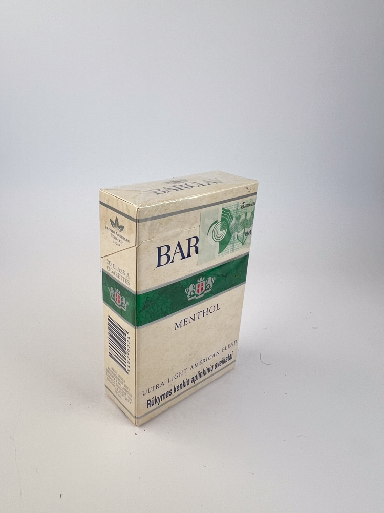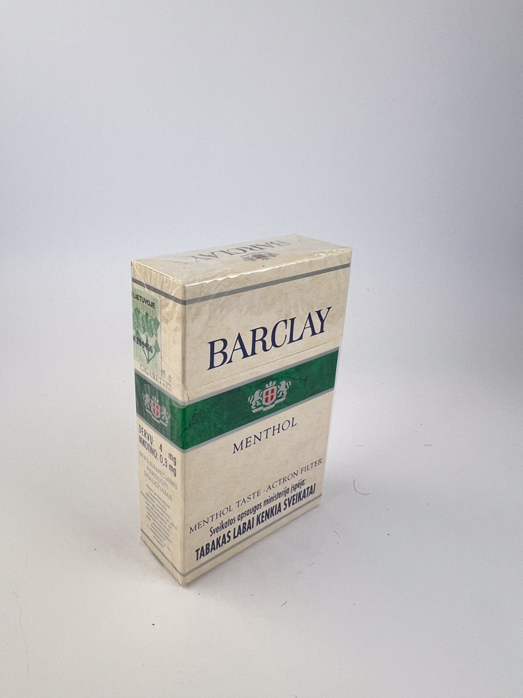 This Barclay Menthol A pack of cigarettes manufactured for the Lithuanian market, with the original Lithuanian excise stamp. The following inscription is clearly visible on the pack: