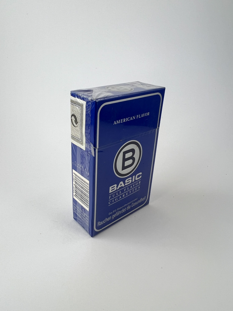 Description: The Basic "Full Flavor" cigarette pack is distinguished by its dark blue color with white letters and a border dominated by a capital "B". The lower part contains warnings in German: "Rauchen gefährdet die Gesundheit" and "Rauchen verursacht Krebs", which indicate that the pack was intended for the German market. The excise stamps of the time are visible on the top and side, which allows us to conclude that the pack was intended for official trade. The packaging is tightly sealed and undamaged.