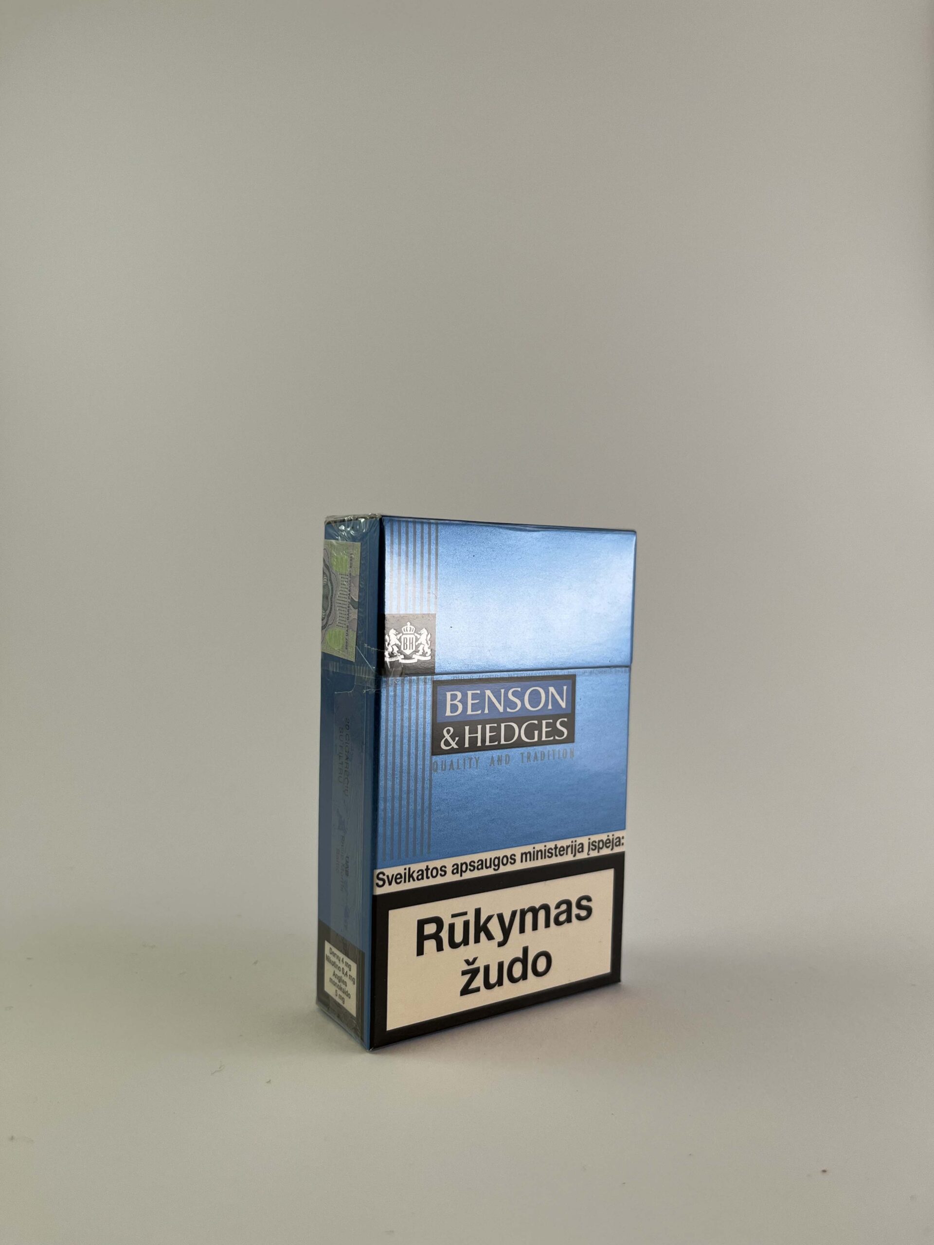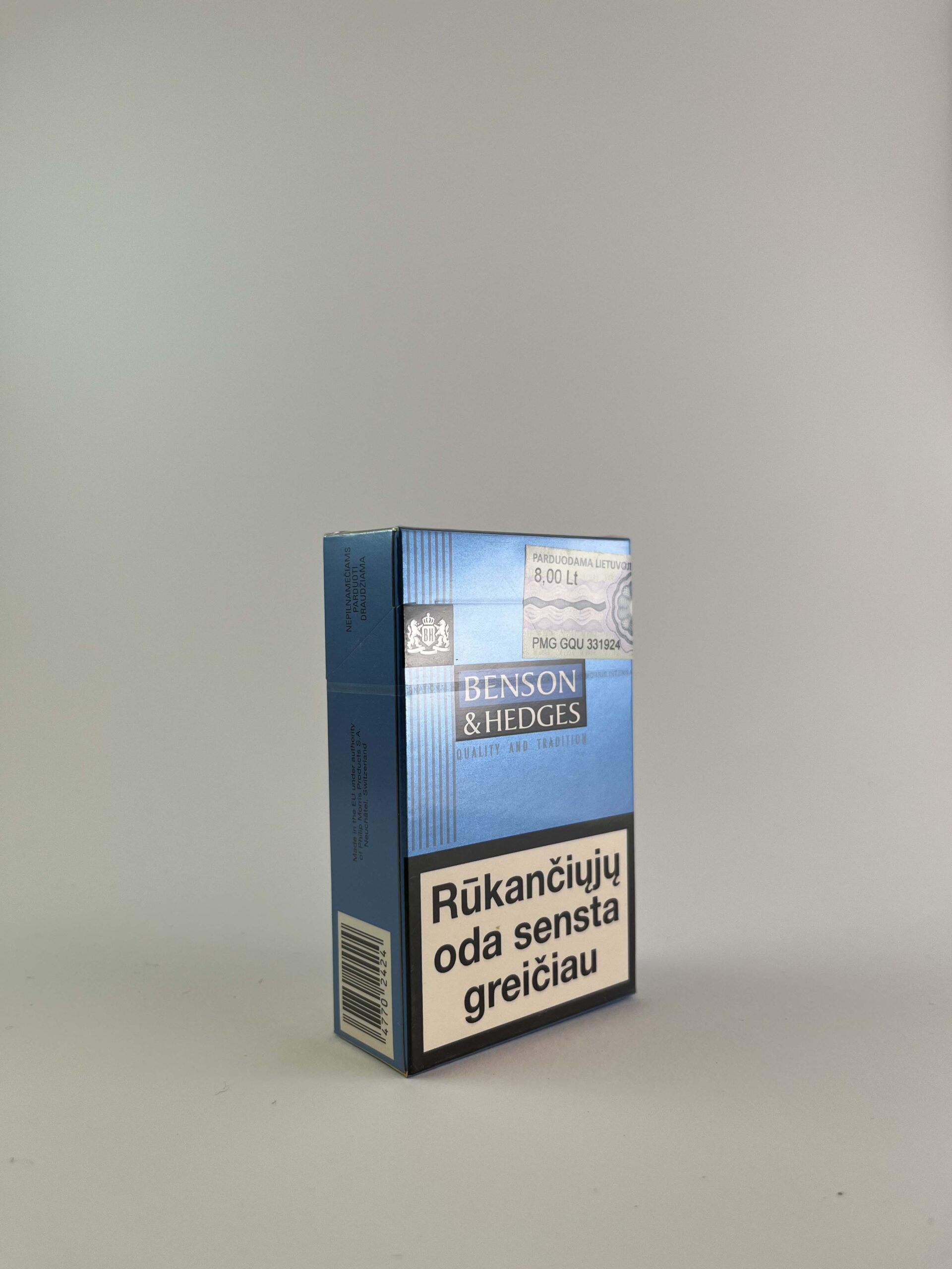 1. Description: The pack is dark blue with the inscription "Quality and tradition". On the front there is the classic Benson & Hedges logo and the Ministry of Health warning about the damage to the skin from smoking. The price is visible at the top - 8.00 LTL.