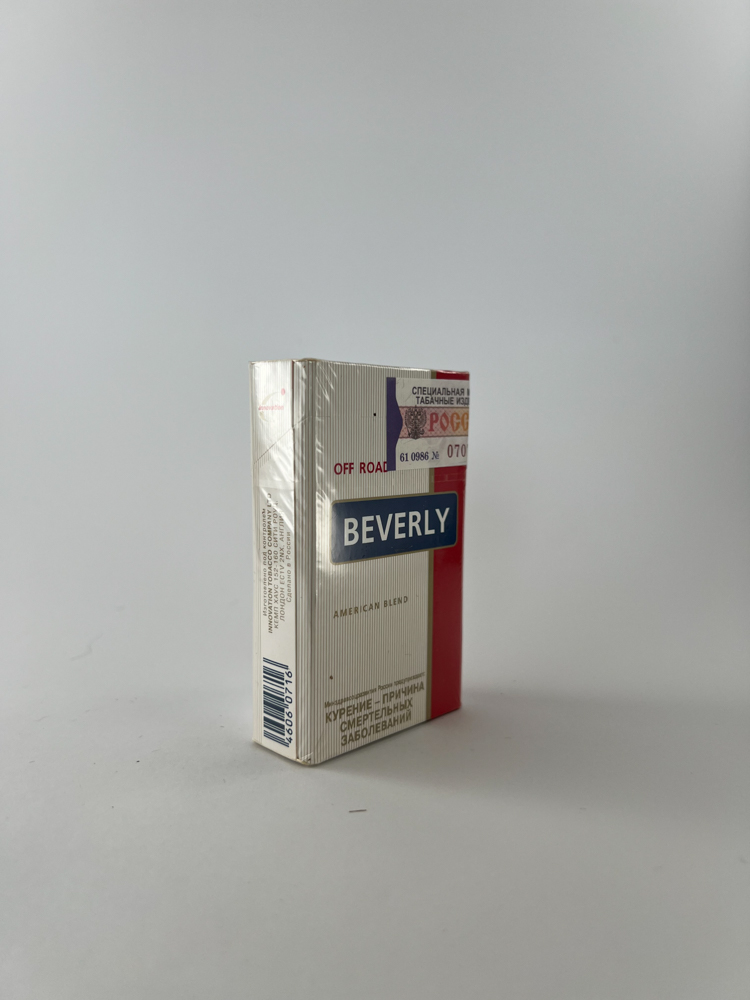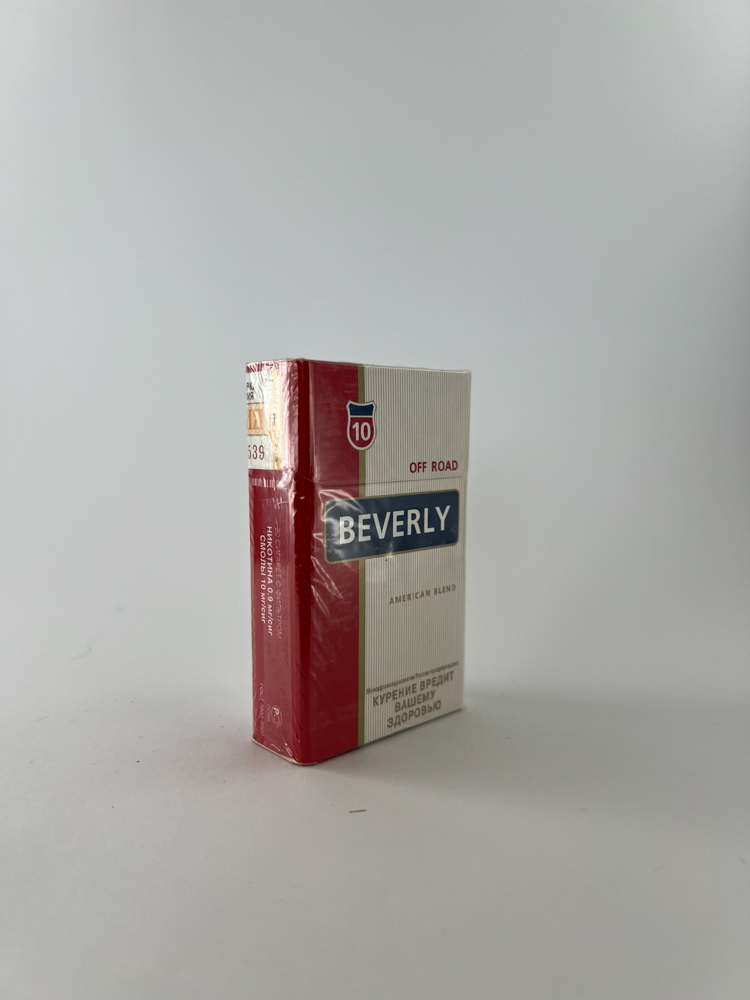 „Beverly Off Road is a cigarette brand promoting an American-style tobacco blend, created for the Russian market. The pack is decorated with the American road sign “10 OFF ROAD„, and the name and design are clearly inspired by the image of “Route 66„ or “Marlboro Country„. Visually, it is a classic, minimalist style package: vertical small stripes, red and white color blocks and a dark blue logo. The package indicates that the manufacturer is a local Russian tobacco factory. Original cellophane with Russian excise duty.