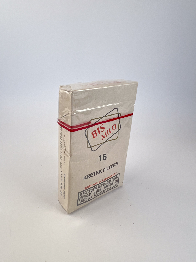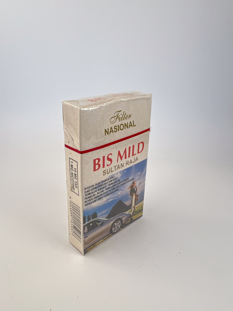 Bis Mild Sultan Raja – a milder type kretek cigarettes from the well-known manufacturer PR Sultan Raja, produced on the island of Madura, east Java. This packet is marked as Filter National, which indicates a mid-to-higher-end product intended for both domestic and partially export markets.