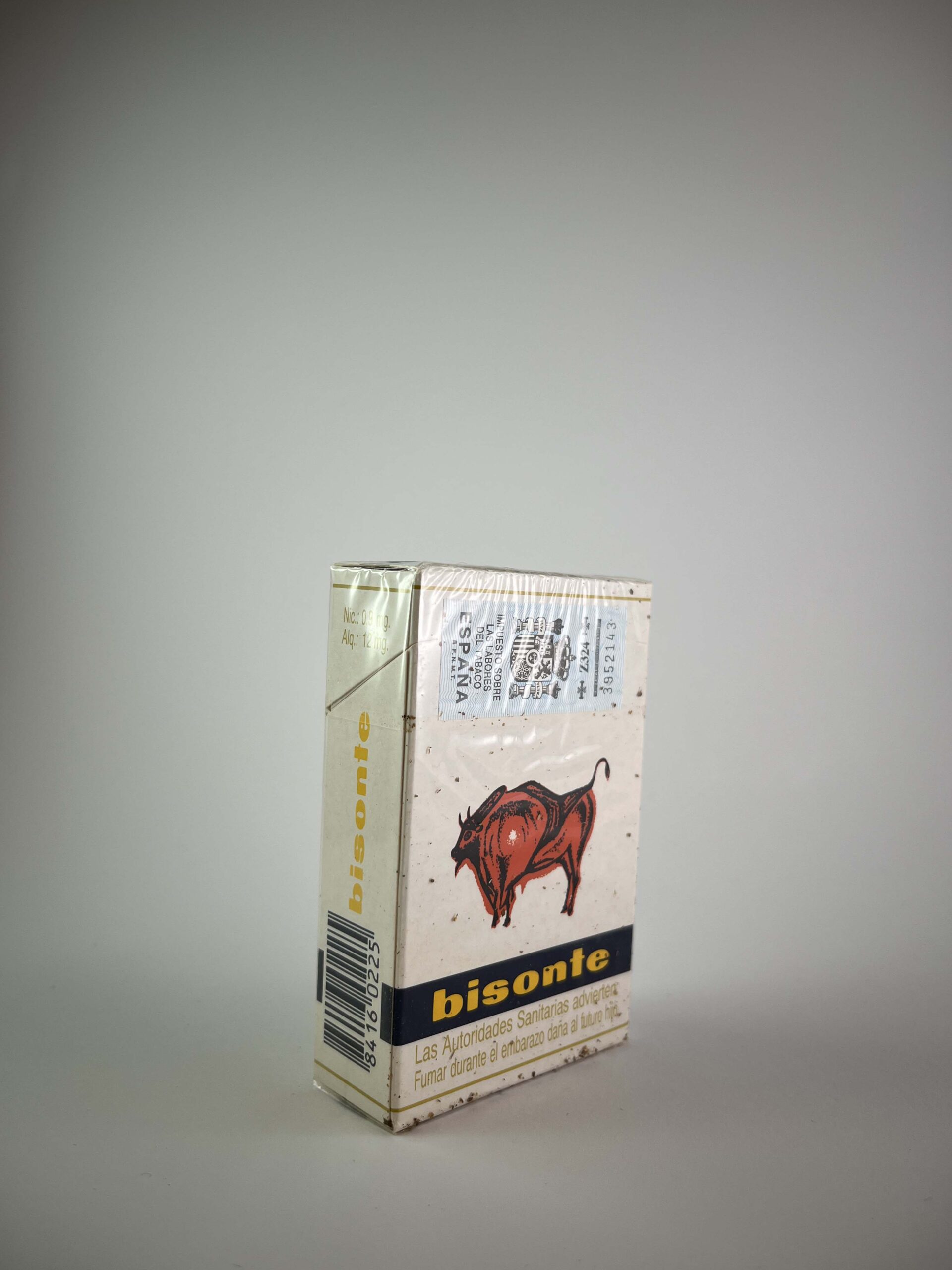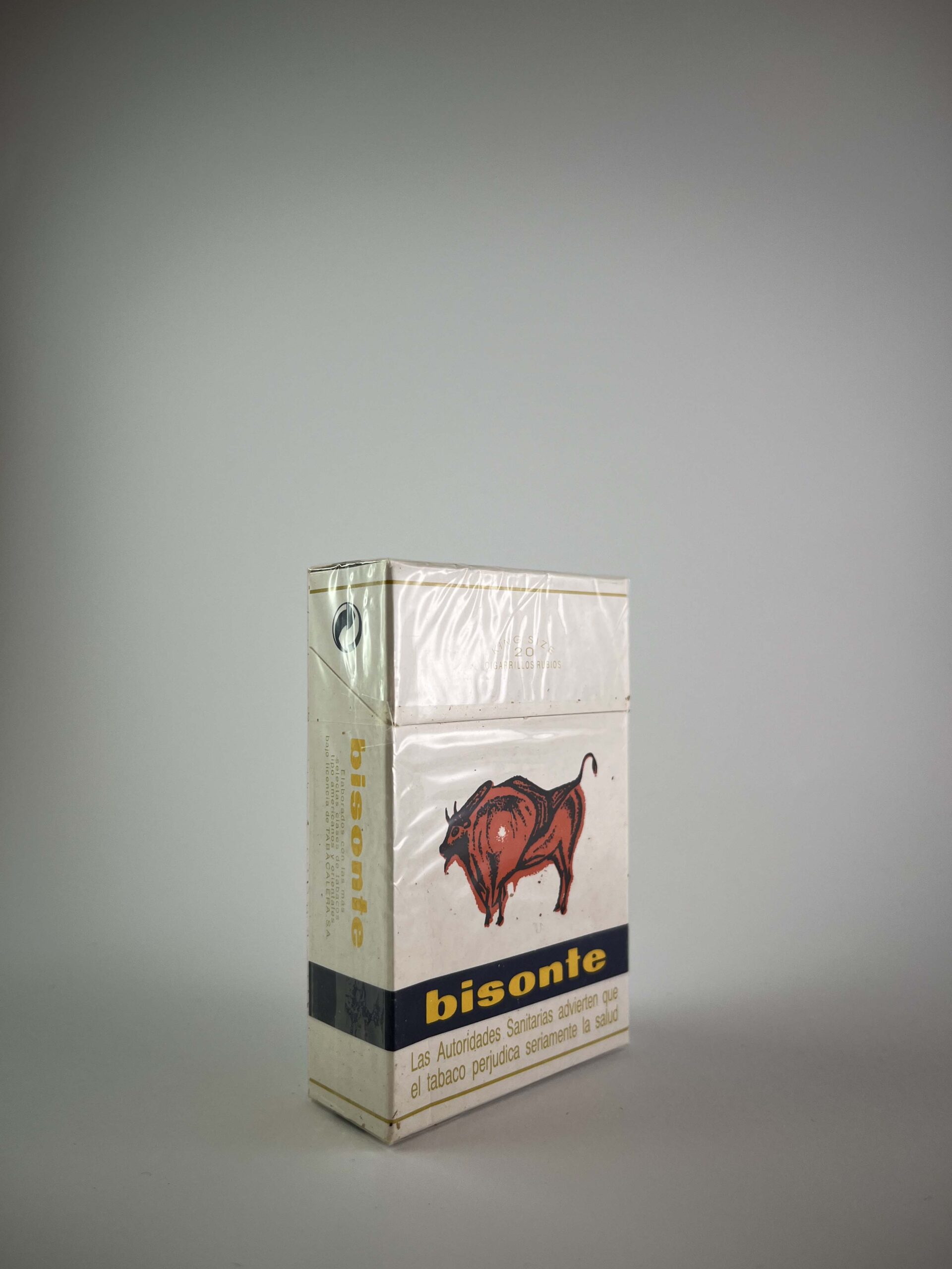 The Bisonte cigarette pack has a classic design, dominated by minimalist aesthetics and animal themes. The central focus is a striking red bison, conveying an impression of strength and tradition. The yellow „bisonte“ logo at the bottom of the pack provides contrast and emphasizes the brand identity. Warnings in Spanish, such as „Fumar durante el embarazo dañará al futuro niño“ (smoking during pregnancy harms the unborn child), clearly indicate that this product was intended for the Spanish market.