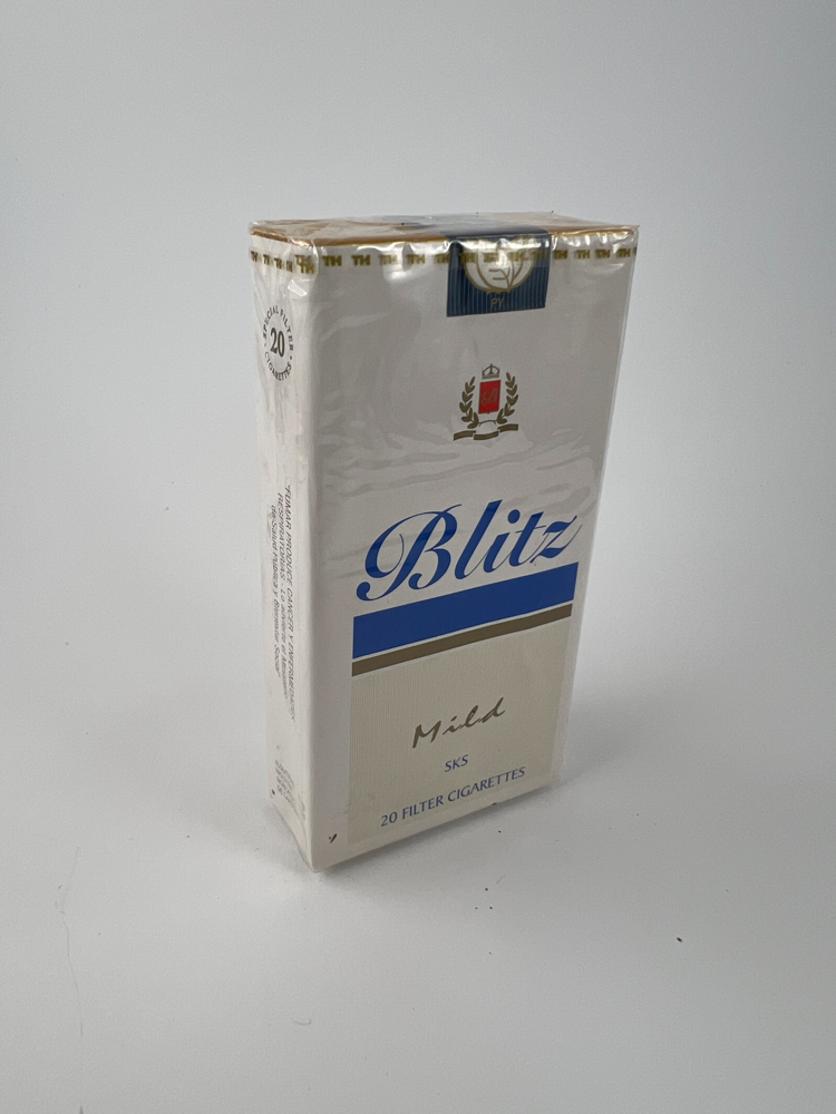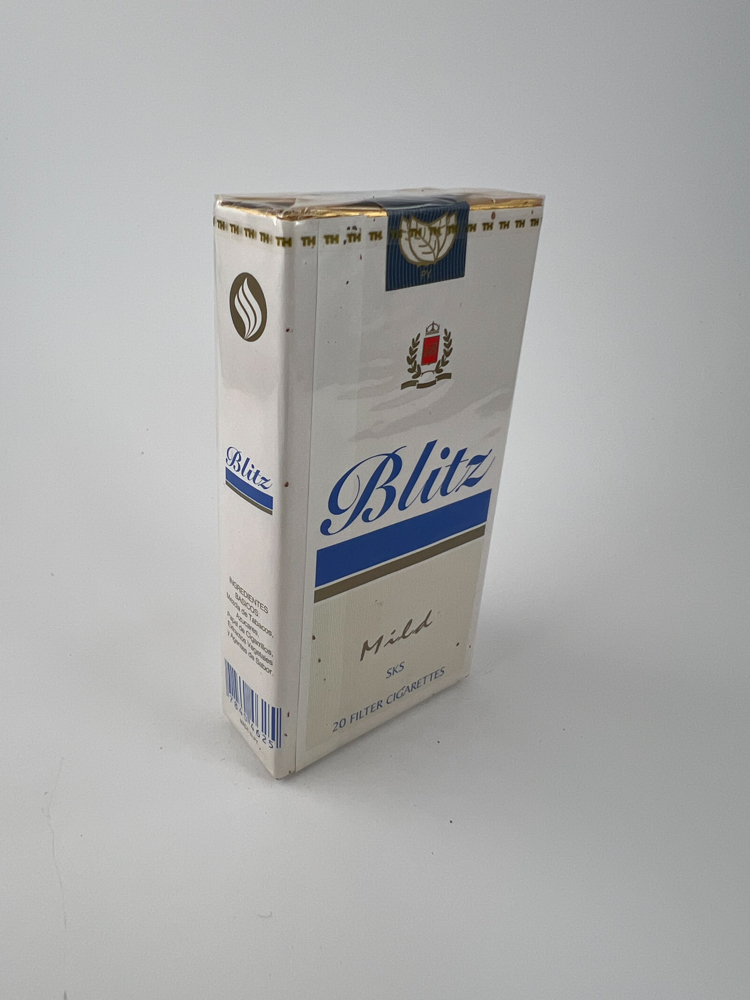 Description: This Blitz Mild pack is white with a blue stripe and a subtle design, emphasizing the „Mild“ variant. The pack is decorated with a coat of arms with a crown and laurel wreath and the „SKS“ logo, which may refer to the manufacturer or type of cigarette. Information in English on the sides indicates that this is a product from the Philippines. Visually, it is a simple but neat economy class pack, intended for the domestic or regional market.