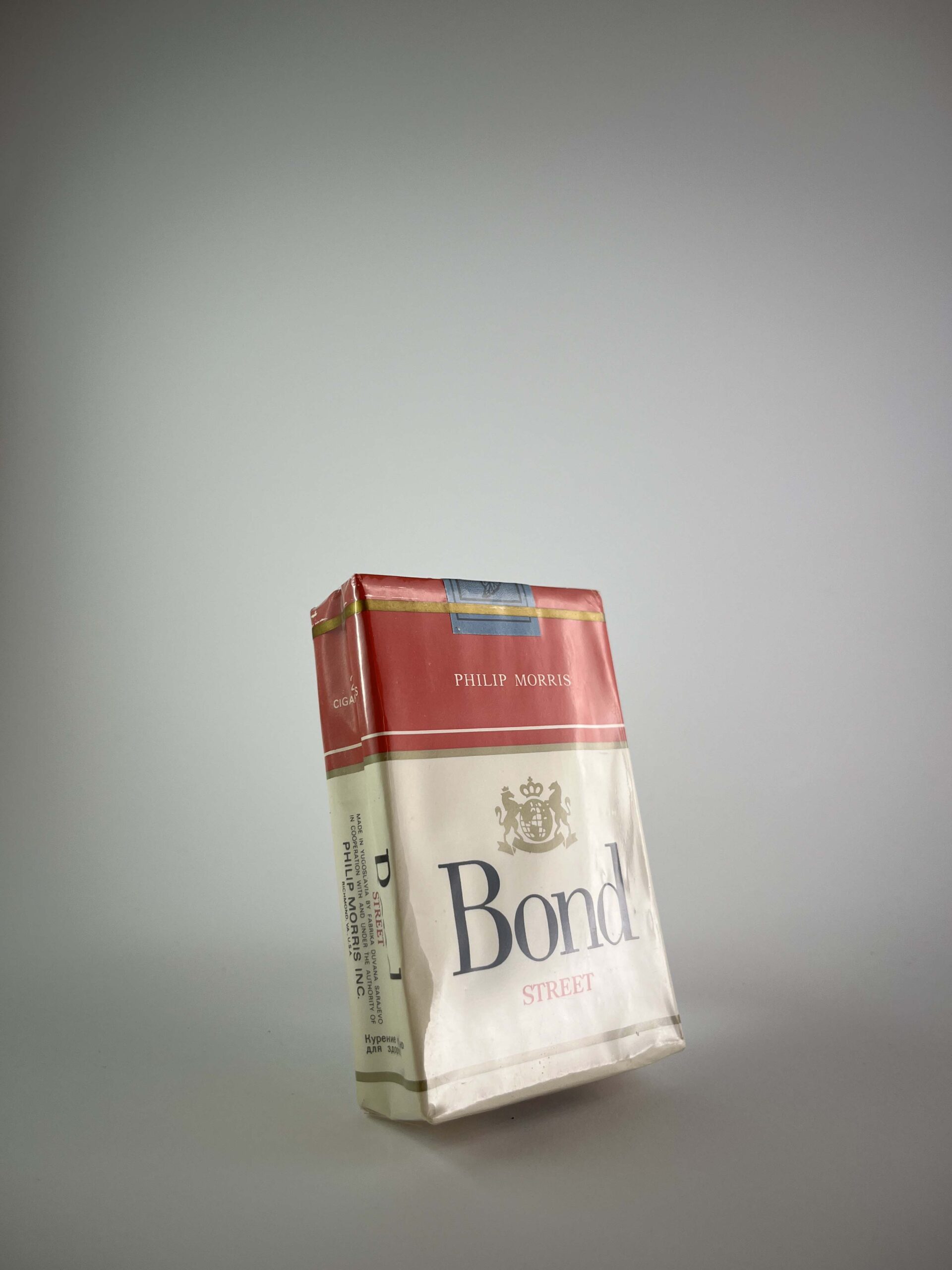 Description: This Bond Street cigarette pack has a classic design with a red and white color combination. The Philip Morris logo and branding maintain the traditional visual aesthetic. The design reflects the economy class cigarettes, which are aimed at the mass market. The warning about the harms of smoking occupies a prominent place on the pack.