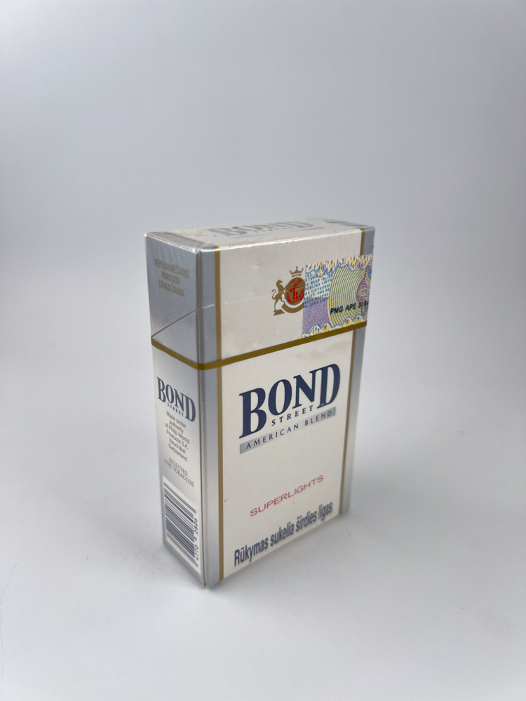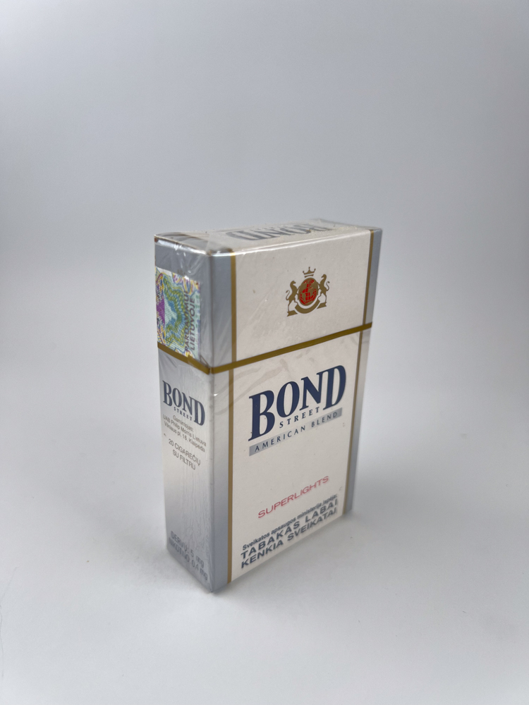 Centre – mėlynas užrašas „BOND STREET AMERICAN BLEND“, o apačioje raudonai – „SUPERLIGHTS“.