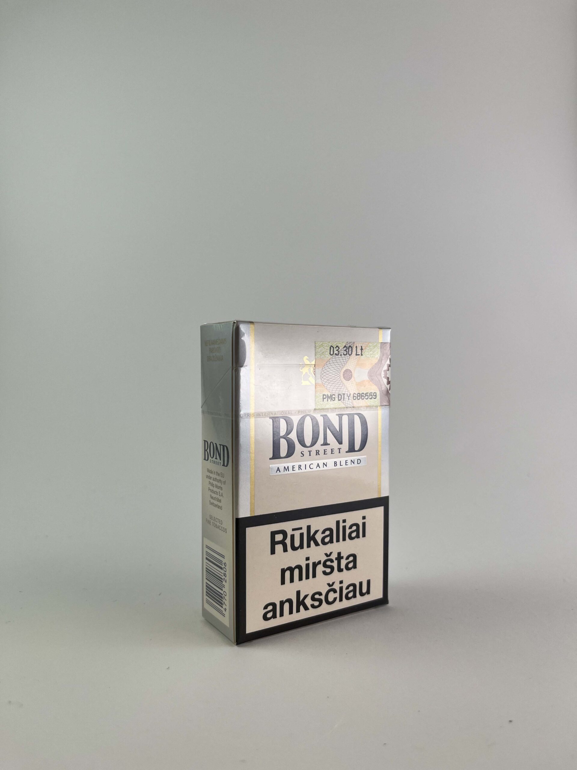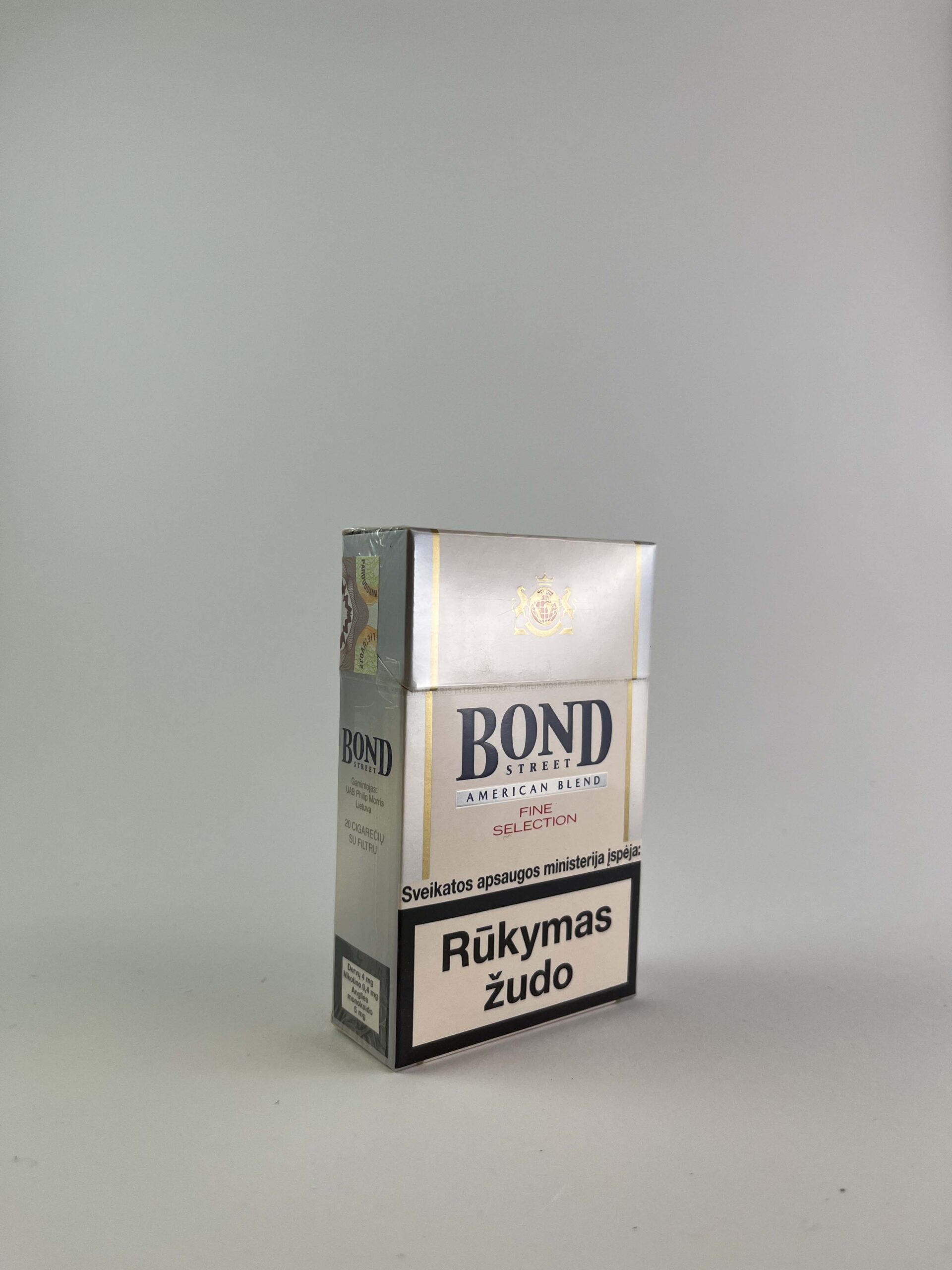 Aprašymas: Bond Street „American Blend Fine Selection” cigarečių pakelis pasižymi elegantišku dizainu, kuriame dominuoja sidabrinės ir pilkos spalvos su klasikiniais logotipais. Šis pakelis yra paprasto, bet solidumo įspūdį paliekančio dizaino, pabrėžiantis prekės ženklo žinomumą ir amerikietiško stiliaus skonį. Įspėjimas apie rūkymo pavojus yra ryškiai pavaizduotas, akcentuojant sveikatos riziką.