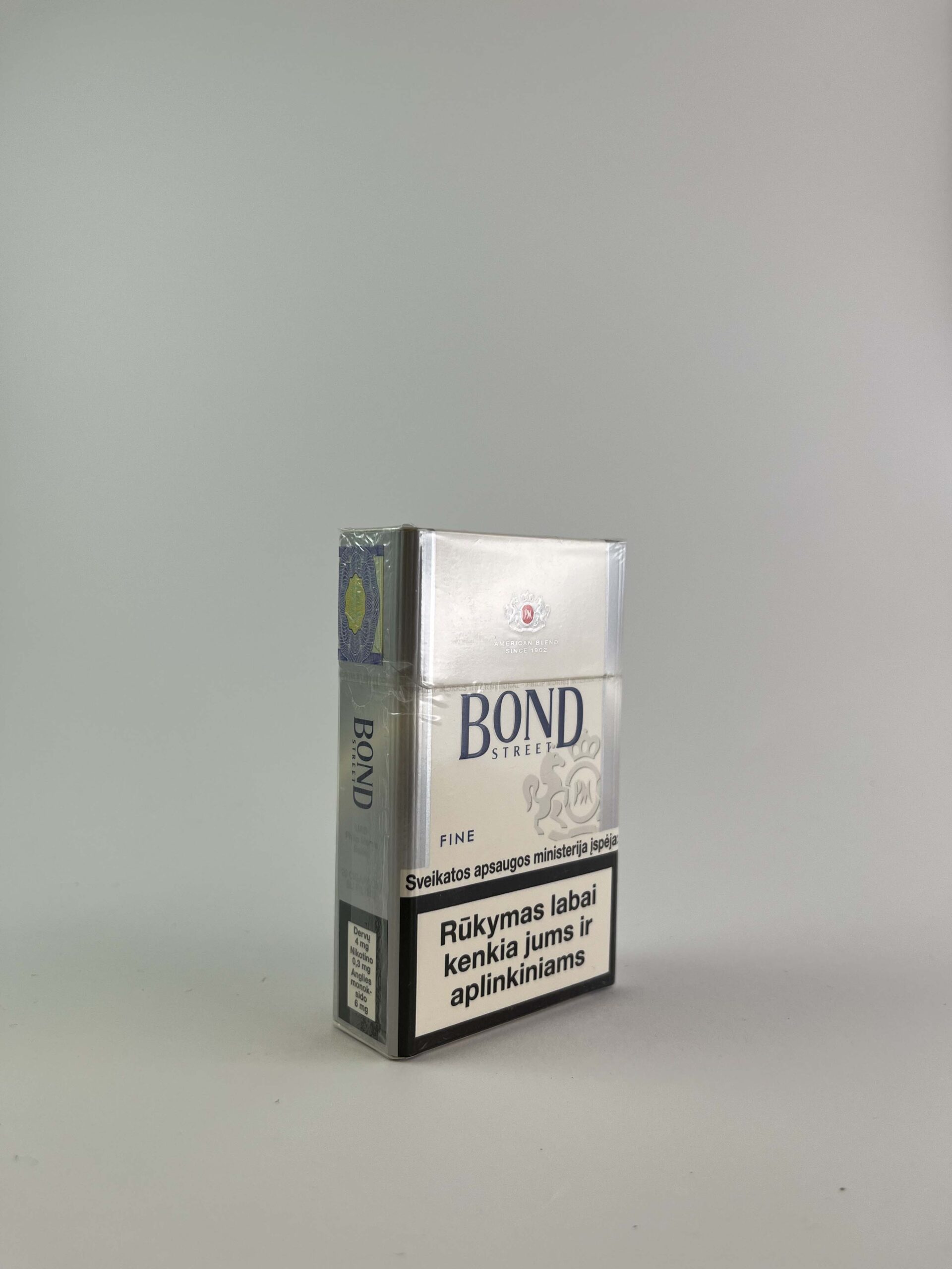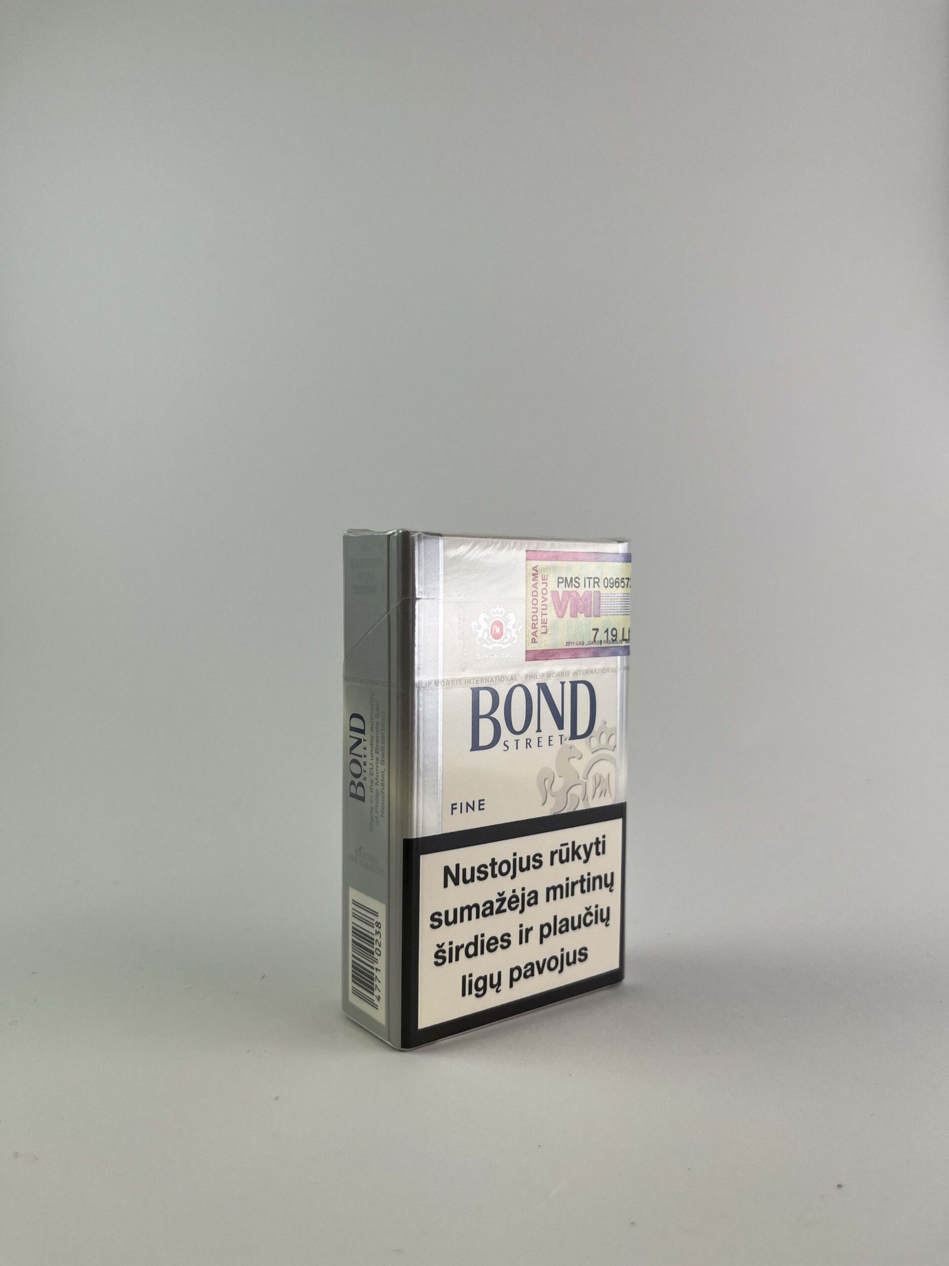 Description: The Bond Street Fine cigarette pack has a minimalist design with a silver background and subtle elements of the Bond Street logo. On the front side there is a warning message about the dangers of smoking, and on the right side of the pack there is a Lithuanian stamp showing the price in litas, which indicates that this pack was sold before the introduction of the euro in Lithuania.