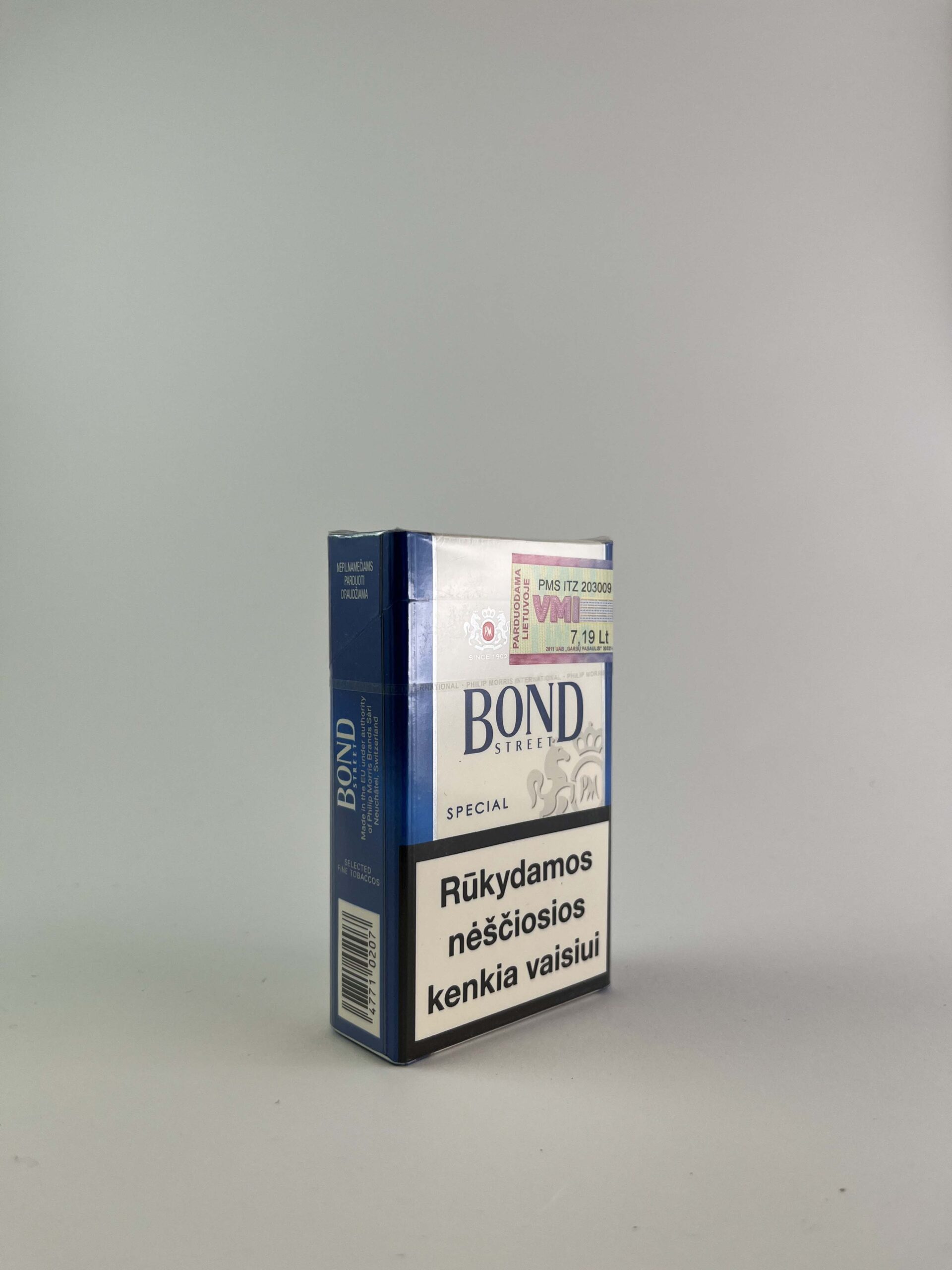 Description: This pack of Bond Street Special cigarettes features a classic gray and blue color scheme, signifying a stronger and darker flavor, the name "Special" and the inscription "American Blend." The front and back of the pack feature large health warnings from the Ministry of Health about the dangers of smoking, encouraging people to quit smoking. On the right side, a Lithuanian stamp is visible, indicating the price in litas, indicating that this pack was intended for the Lithuanian market before the introduction of the euro.