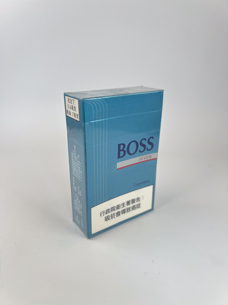 The light blue BOSS Lights (also known as BOSS Seven) pack features a subtle, modern design focused on a minimalist aesthetic. The background is metallic, with a soft sheen, with vertical stripes on the side that give a sense of structure. The BOSS logo is in black, with the words „LIGHTS“ or „SEVEN“ in smaller red letters below, depending on the release. The design emphasizes the clean, technologically sophisticated image typical of the Asian tobacco industry in the early 2000s. The bottom part reads „Charcoal Filter Cigarettes“ and the side has technical specifications in Chinese, indicating the Taiwanese market origin.