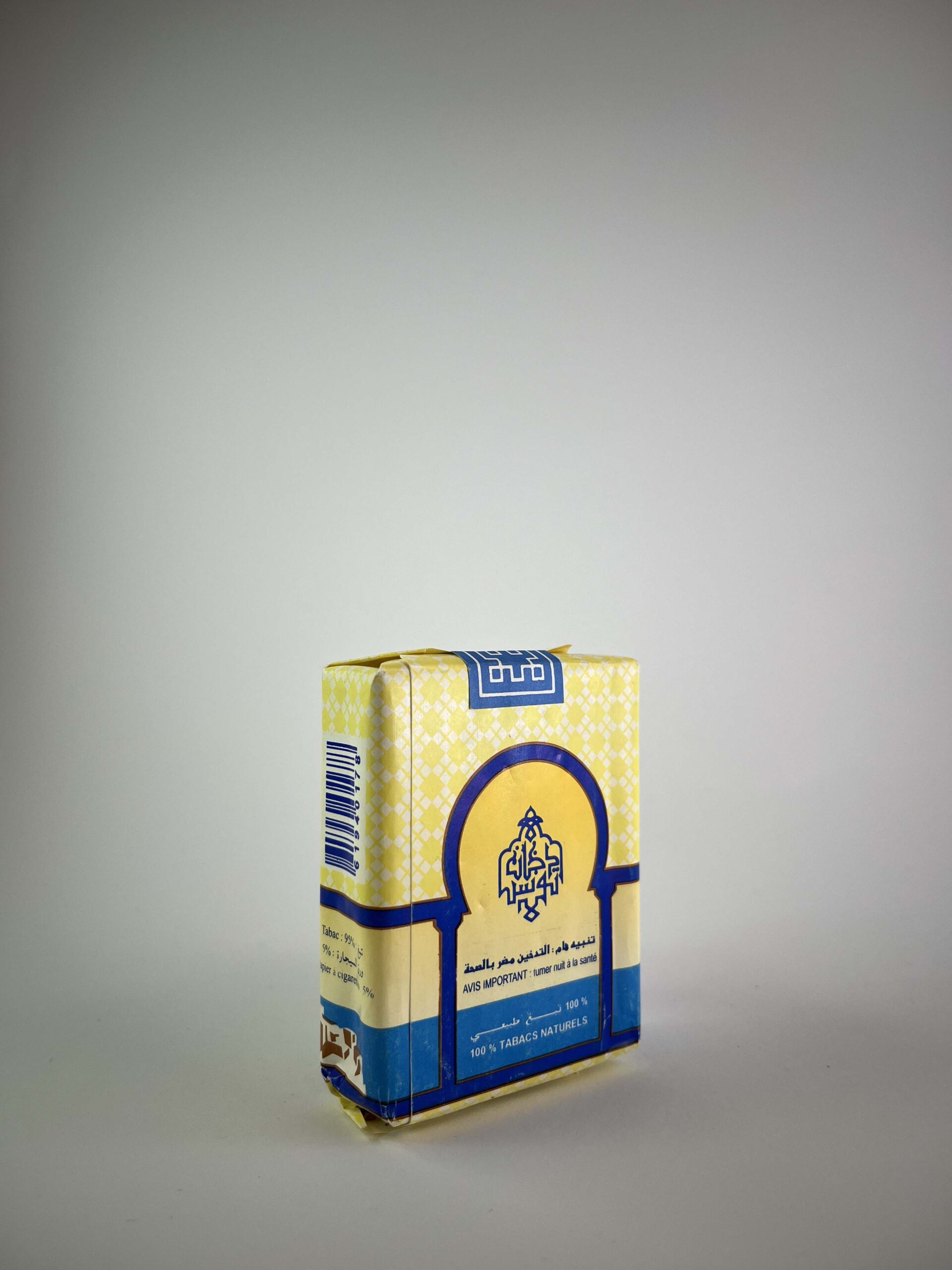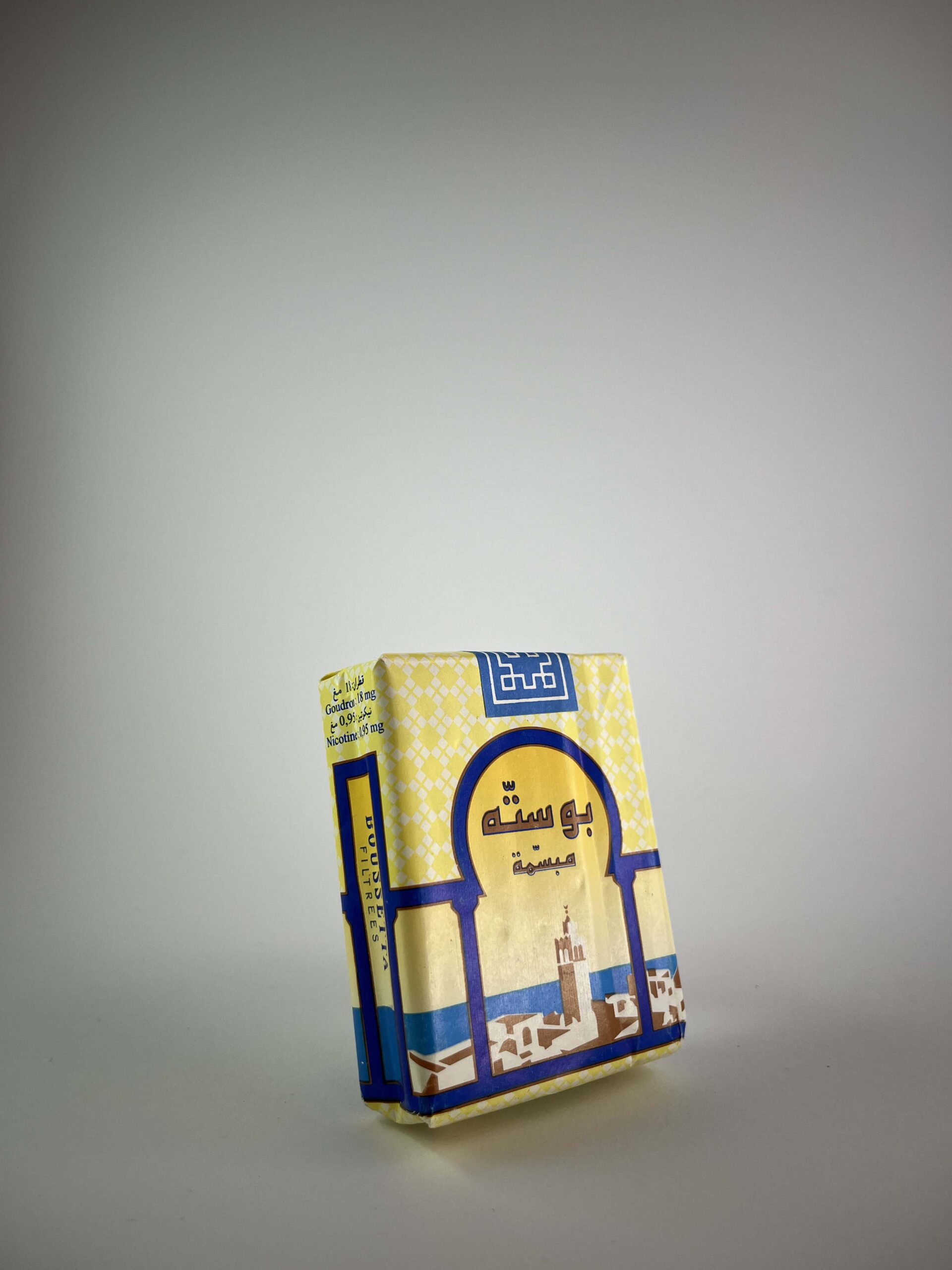 Description: This Bou Sâada cigarette pack features a bright yellow design with traditional architectural motifs and blue accents. The look of the pack reflects Mediterranean culture and Algerian traditions. The logo and inscriptions in Arabic reflect the local market. Information on the tobacco composition and manufacturer's warnings are provided in Arabic and French. The uniqueness of this pack lies in its authenticity and rarity outside the region.