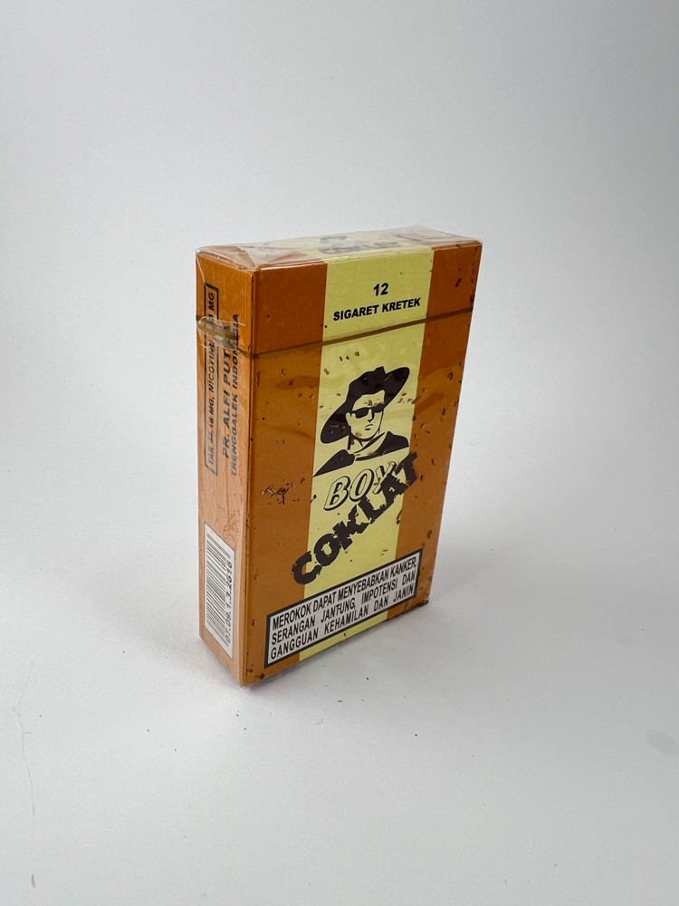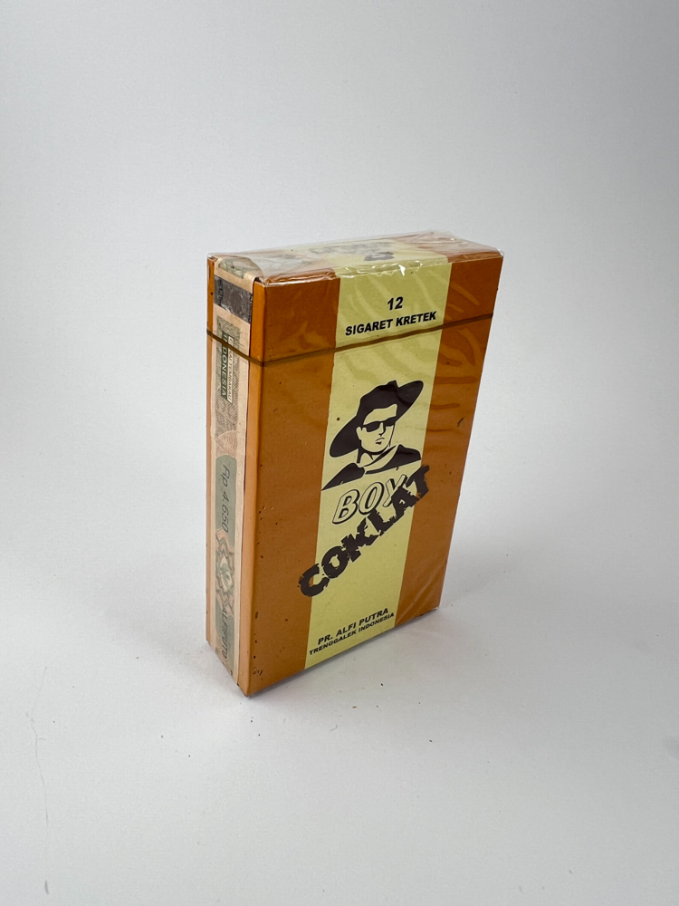 Brown ("coklat") minimalist design package with a stylized face of a man wearing glasses and a hat. The design is quite simple, with a bright logo "BOX COKLAT". The package states that these are "sigaret kretek" (traditional clove cigarettes). On the side of the package there is an excise sticker with the price "Rp 4,650", which allows you to determine the production period. On the front side there is a standard Indonesian health warning.