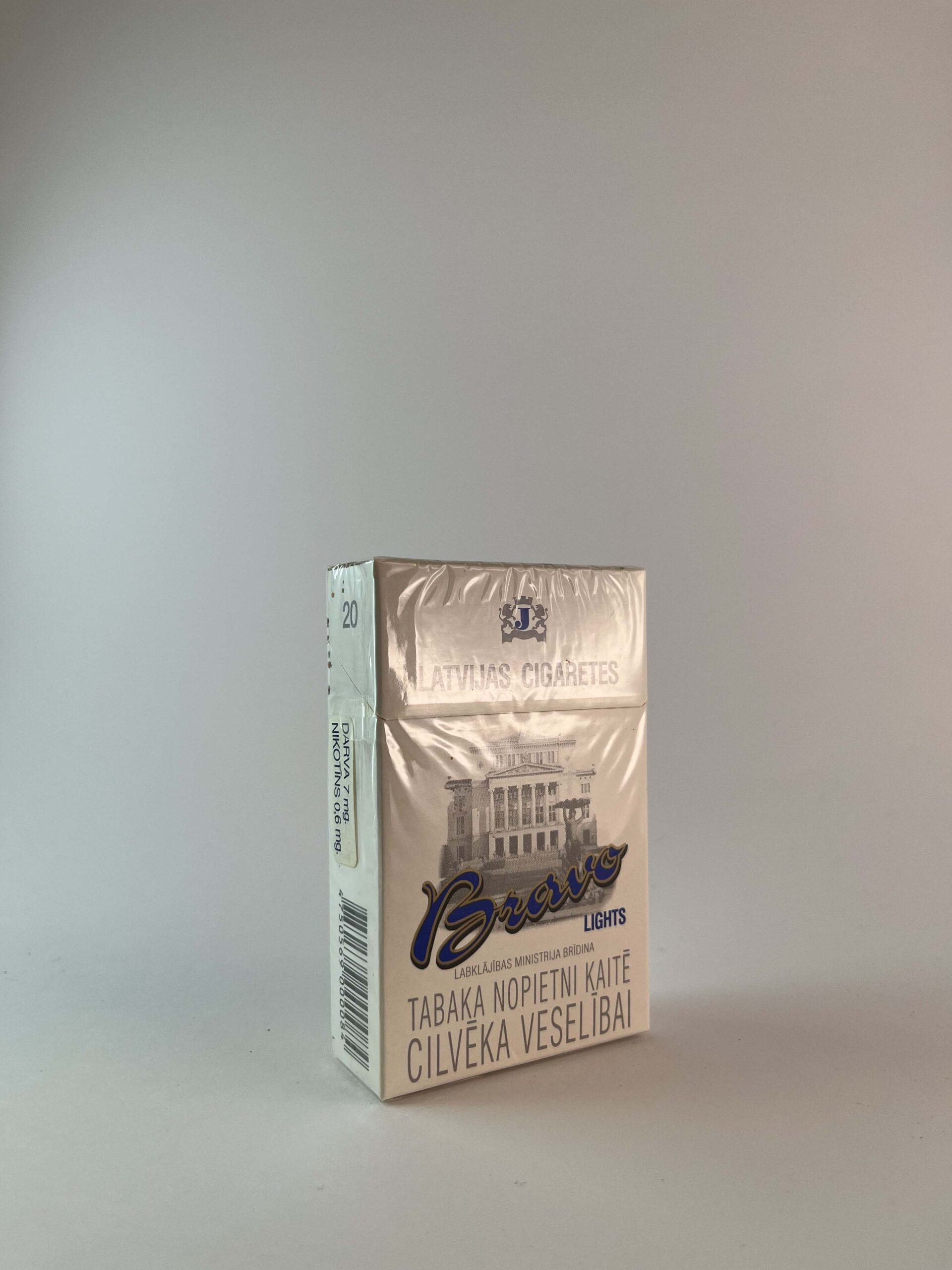 Description: This pack of Bravo cigarettes is a combination of white and blue colors, emphasizing a minimalist and neat design. The main highlight is the „Lights” inscription, indicating a lighter taste. The pack has a prominent health warning that informs consumers about the risks of smoking. The „Bravo” brand is quite popular in the Baltic countries, and this „Lights” edition is aimed at those who prefer less strong cigarettes.