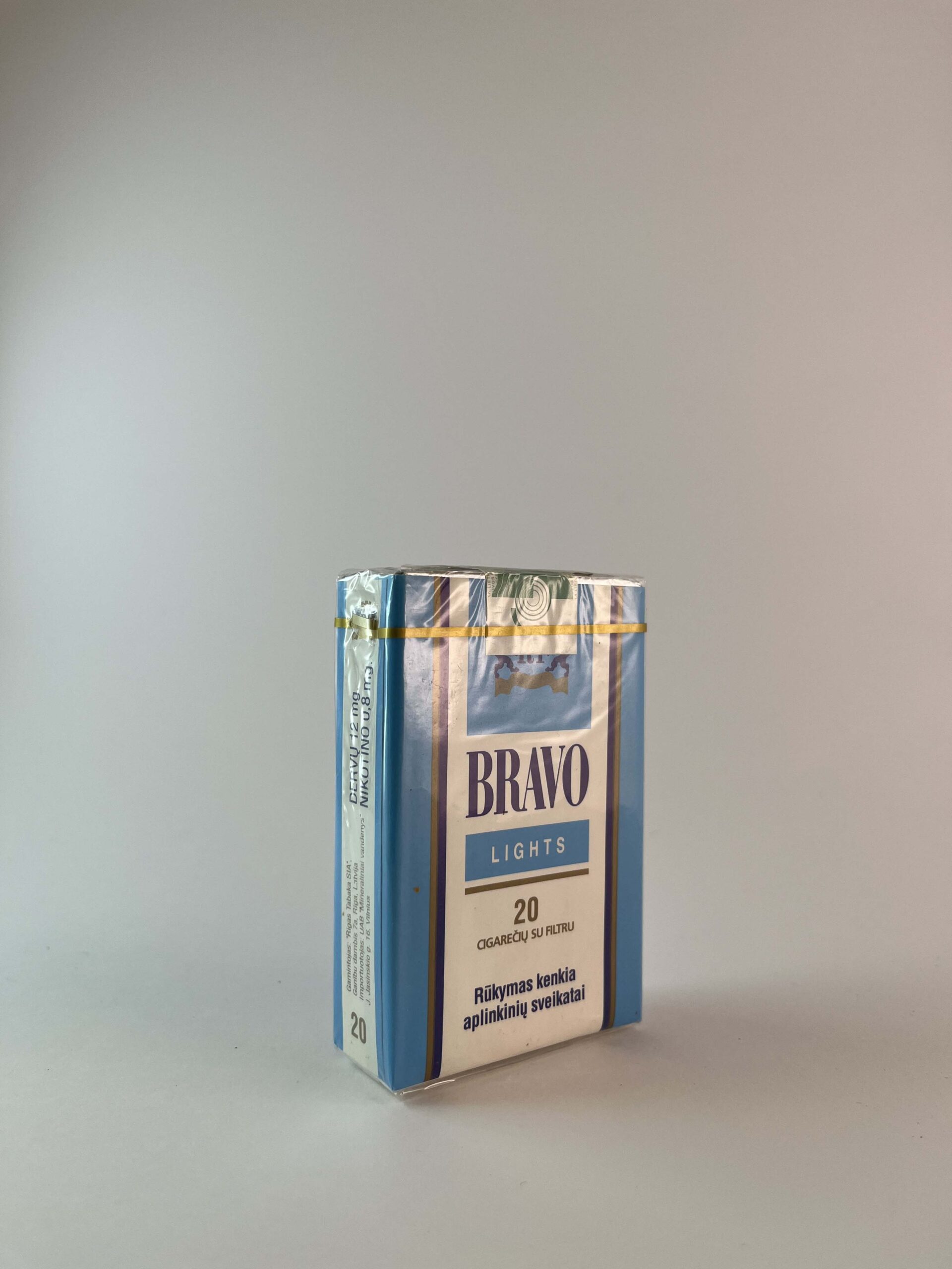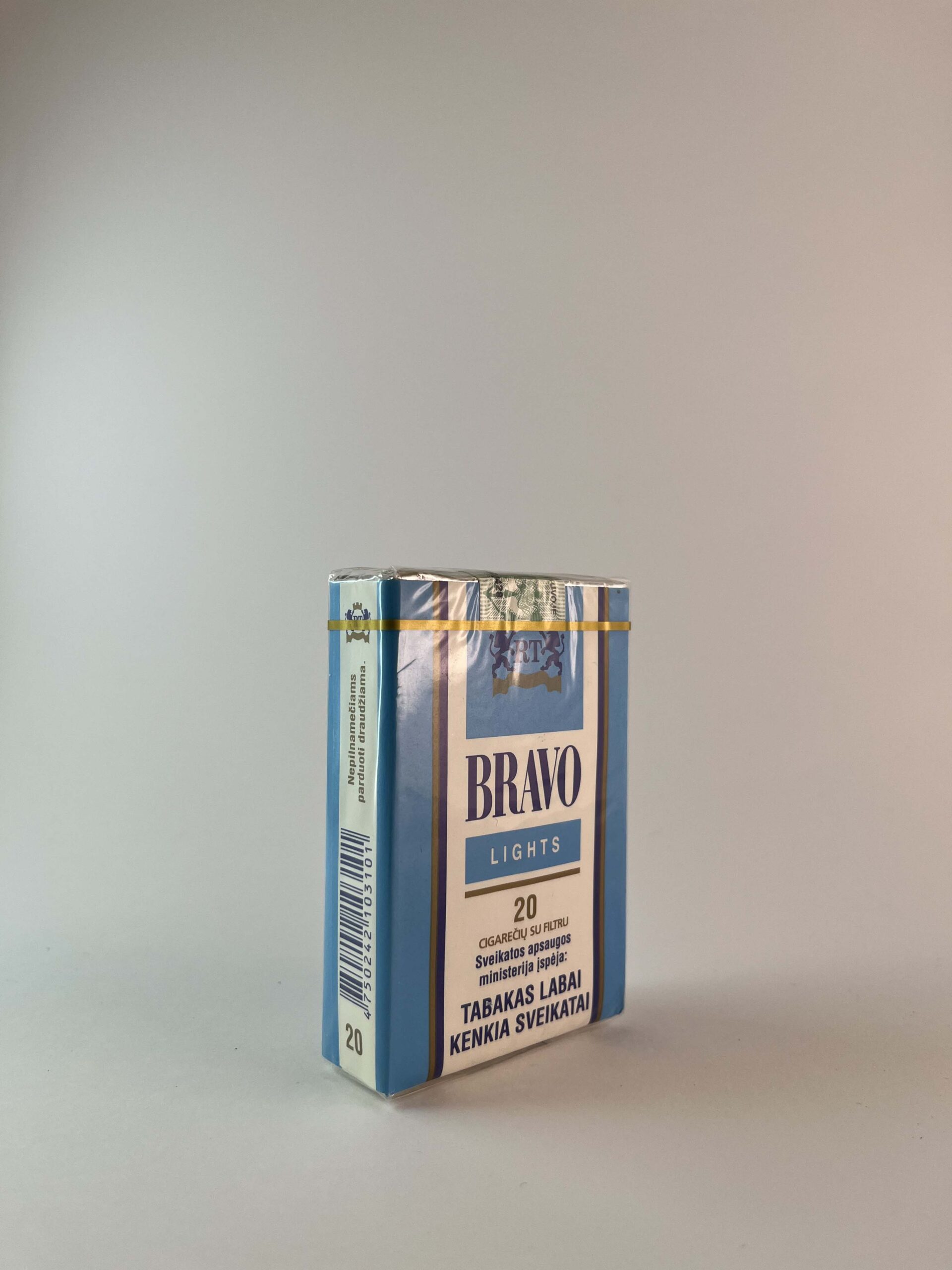 Description: The Bravo Lights cigarette pack features a modern design with blue accents, which are often associated with a lighter taste. The pack carries health warnings in Lithuanian about the effects of smoking. The „Lights“ line often refers to a lighter tobacco blend, which promotes a lower strength smoke. The pack design is simple, making it attractive to the local market.