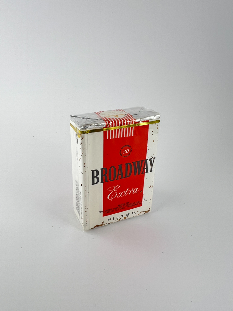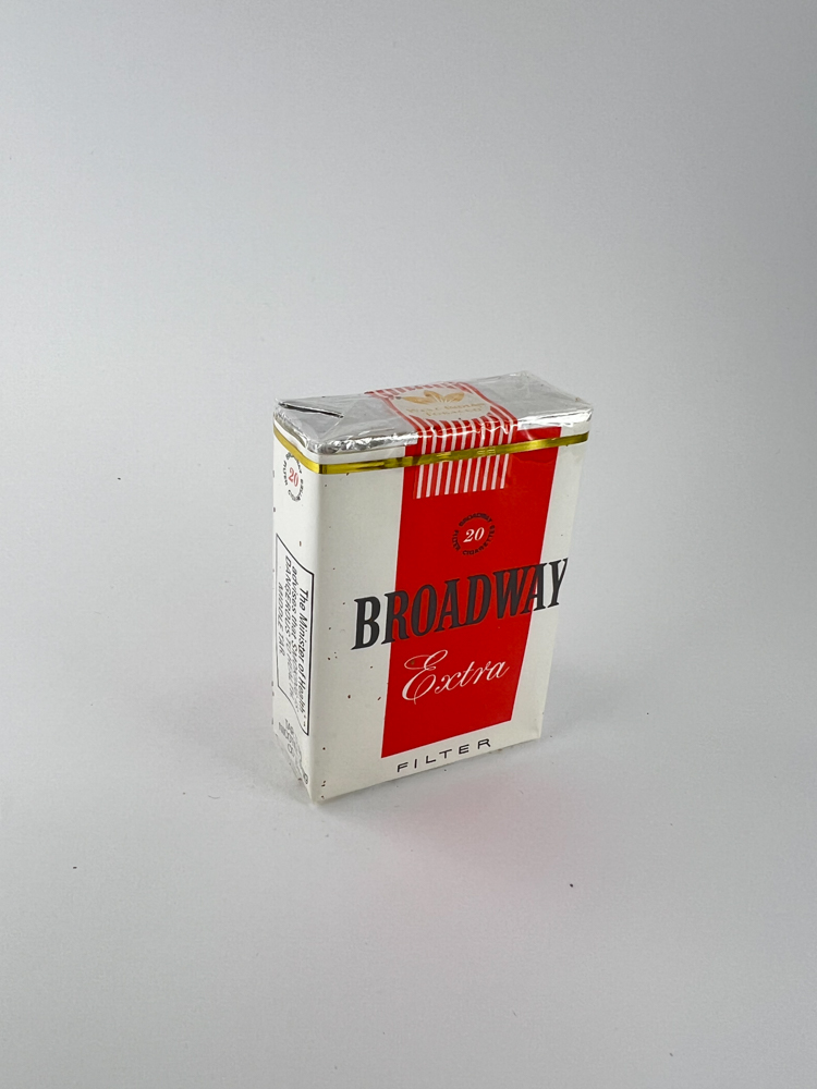 Description: Broadway Extra is a rare type of cigarette produced in the Caribbean region - specifically in Trinidad and Tobago. The pack features a retro design - a bright red vertical central block, a white background and black and red lettering. It is a classic-looking pack with the filter indication ("FILTER") and manufacturer information highlighted at the bottom. Such a product was intended for the local or regional market and rarely appears in international collector circulation.