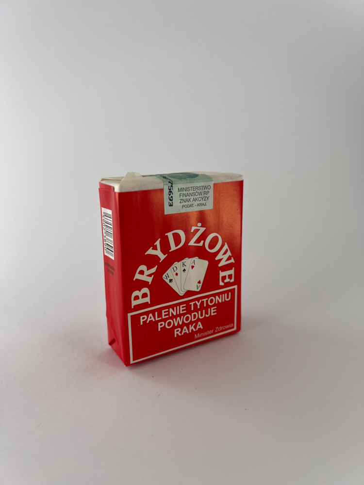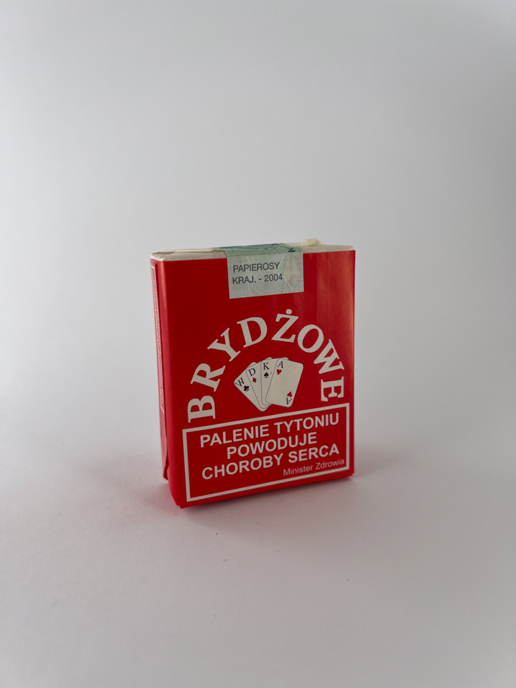 „"BRYDŻOWE" is an exclusive cigarette pack, the design of which is focused on the theme of the board card game - bridge. The name "BRYDŻOWE" means "for bridge", and the central part visually depicts four cards (W, D, K, A - Polish symbols for king, queen, etc.). The bright red background and white typography contrast create an eye-catching effect. The lower part contains warnings about the harm of smoking, and at the top is a promotional stamp indicating the date of production (2004).