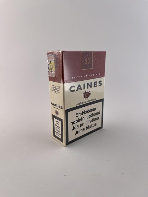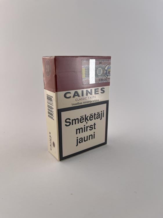 Aprašymas: Šis „Caines Classic Taste“ cigarečių pakelis pasižymi klasikiniu biudžetinio segmento dizainu – bordo spalvos viršumi ir šviesia kremine apatine dalimi su centriniu „CAINES“ logotipu. Dizainas gana minimalistinis, orientuotas į funkcionalumą, o ne išskirtinumą. Ant pakelio aiškiai matomi latvių kalbos sveikatos įspėjimai, tokie kaip „Smēķēšana nopietni apdraud jūs un cilvēkus jums blakus“ bei „Smēķētāji mirst jauni“, taip pat Latvijos akcizo banderolė. Tai leidžia tiksliai identifikuoti, kad pakelis skirtas Latvijos rinkai. Tokie regioniniai variantai kolekcionieriams yra įdomesni nei standartiniai EU leidimai, tačiau pats prekės ženklas nėra plačiai kolekcionuojamas.