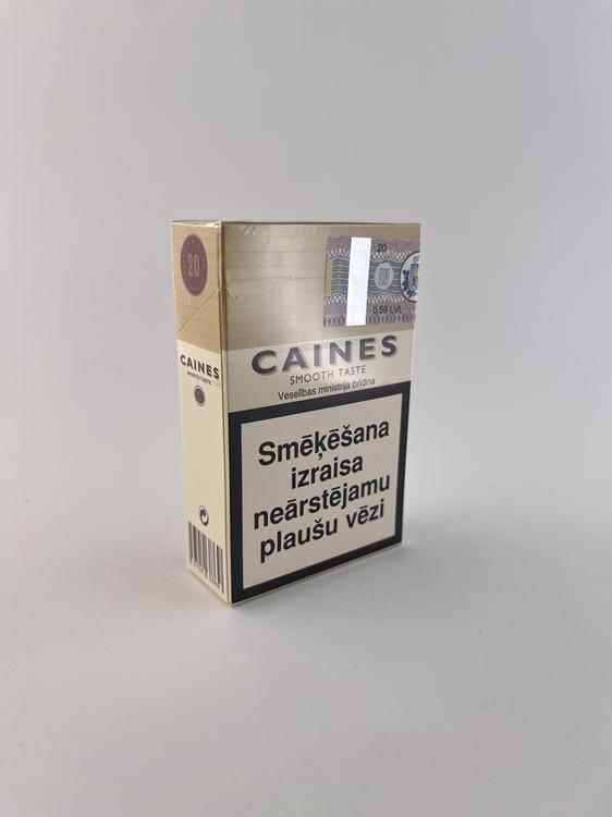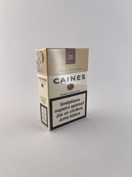 Šis „Caines“ cigarečių pakelis pasižymi šiltu, smėlio ir aukso atspalvių dizainu, kuris suteikia jam kiek solidesnį ir „premium“ tipo įvaizdį. Priekinėje dalyje aiškiai išryškintas prekės ženklo pavadinimas bei „Special Silk Filter“ žymėjimas, pabrėžiantis produkto savybes. Dizainas papildytas subtiliomis linijomis ir minimalistiniu fonu, o bendras vaizdas yra tvarkingas ir vizualiai subalansuotas. Latviški sveikatos įspėjimai rodo regioninę rinką, o bendras stilius atspindi šiuolaikinės, bet ne prabangios klasės produktą.