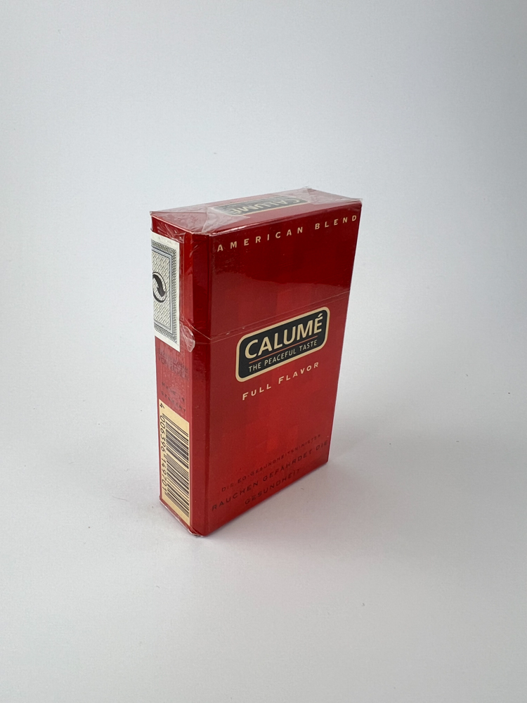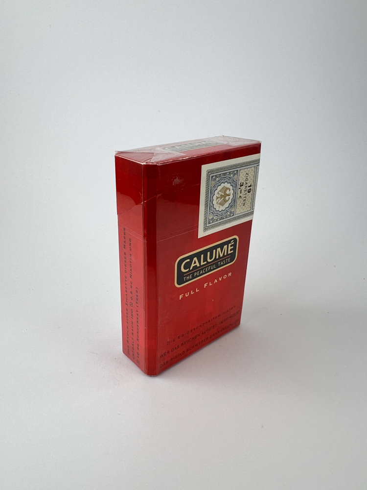 Description: The Calumé „Full Flavor“ cigarette pack features a bright red design with a gold logo and the slogan „The Peaceful Taste“. The top states that it is an „American Blend“ type of tobacco. The pack has a German excise stamp and warnings in German such as „Rauchen gefährdet die Gesundheit“, indicating that it was intended for the German market. The packaging is in excellent condition, tightly sealed, with all original details.